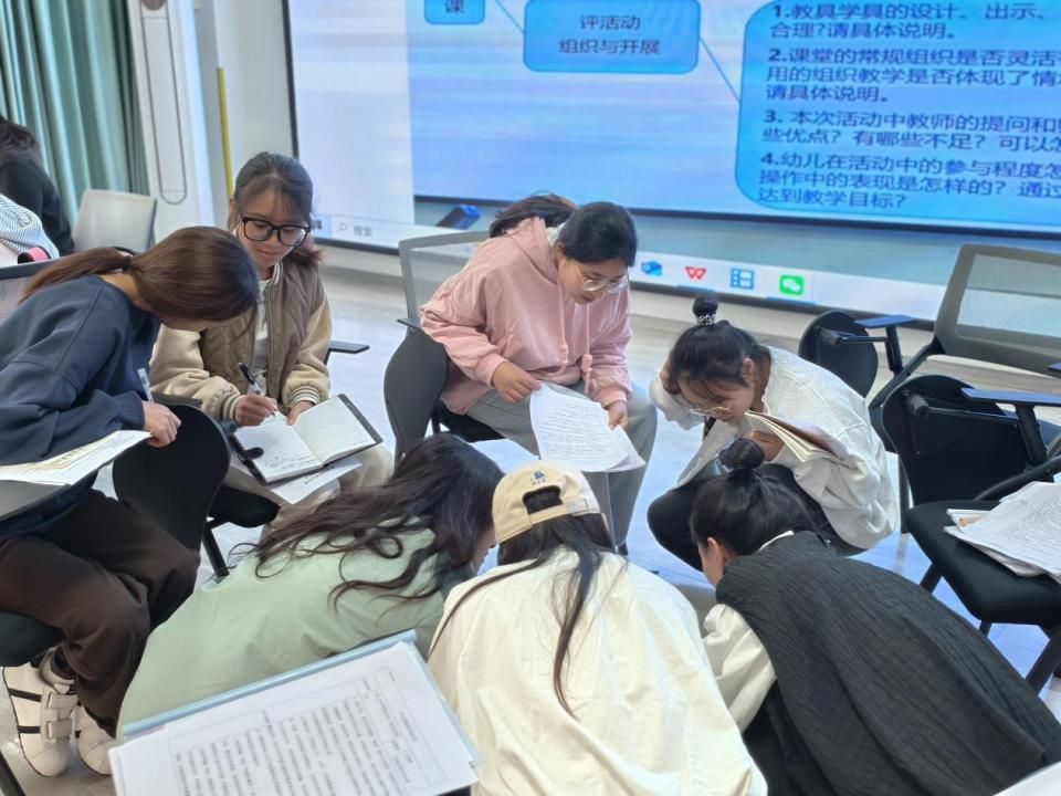 赛课结束后,见习生在幼儿园教师的组织下分为三组,积极参与课后研讨,与一线教师共同围绕教案设计、教学环节与师幼互动等方面展开深入交流。