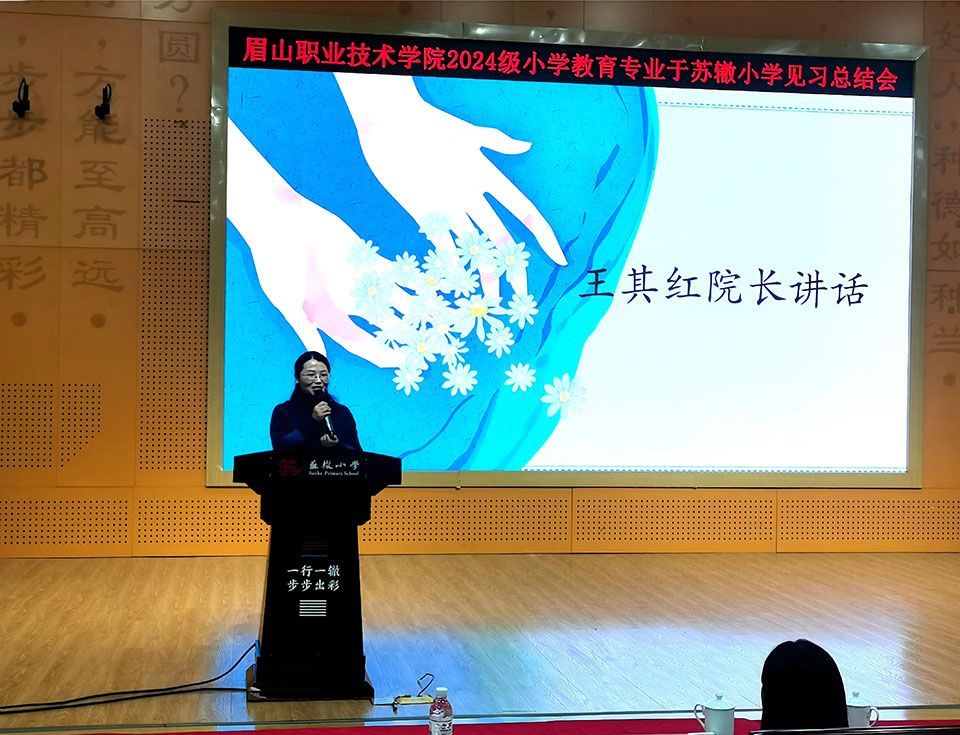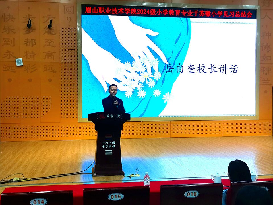 2025年10月31日,教育与文化传媒学院2024级小学教育专业见习总结会在眉山市东坡区苏辙小学俯仰厅顺利召开。苏辙小学校长岳自奎、教导主任雷庆、教育与文化传媒学院副院长王其红、学前教育教研室主任王甜然、带队教师唐秋及全体见习生共同参会。会议由见习生张兴彤主持。
