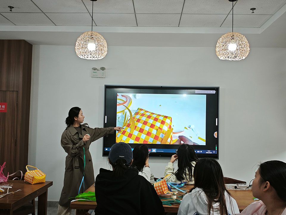 活动开始,非遗中心教师罗琳与学生代表通过丰富的图文资料,为同学们系统介绍了竹编技艺的悠久历史、多种编织手法及其背后所承载的劳动人民智慧与生活美学。在生动的讲述中,同学们了解到竹编从日常实用器物升华为艺术品的演变历程,体会到“以竹为媒,以编为语”的文化内涵与表达方式。罗琳从最简单的十字打底入手,现场演示藤编包包的基本制作流程:左手固定胶布,右手牵引竹条,每一个步骤都细致拆解、耐心讲解。师生们认真聆听,跃跃欲试,充满期待。
