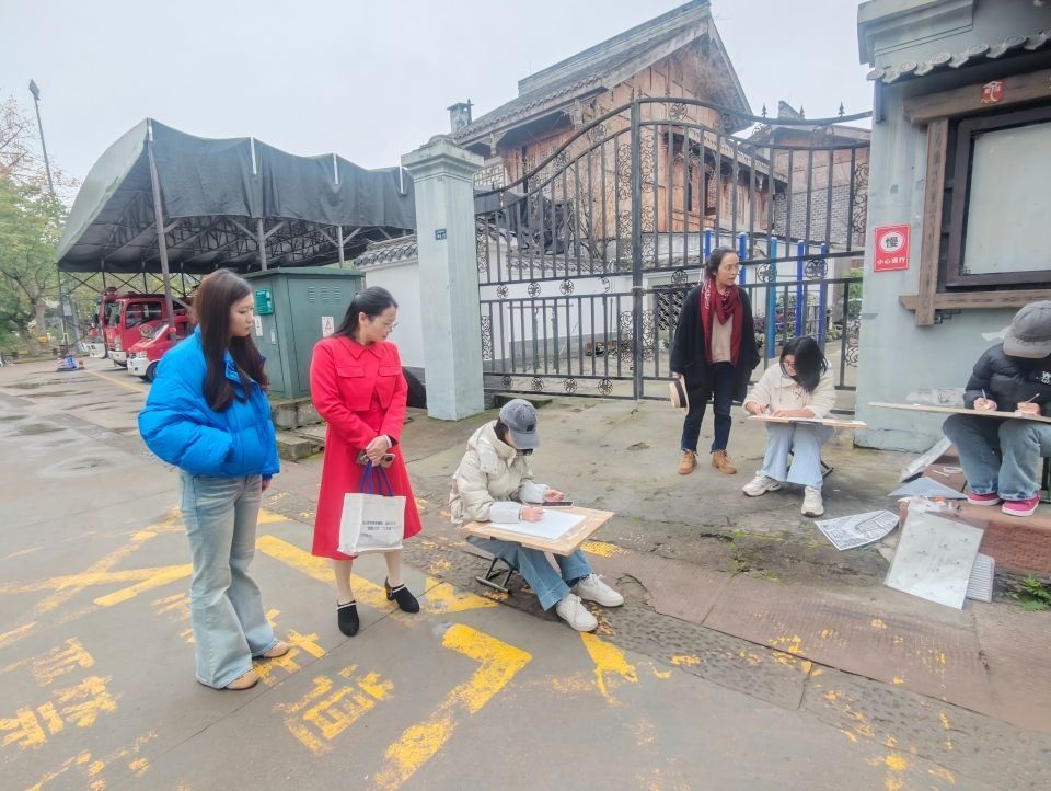 11月14日,王其红带队检查写生活动,逐一走访和了解学生的学习进度与生活保障情况。王其红充分肯定了学生们展现出的专业素养和学习热情,并表示:“黄龙溪古镇深厚的历史底蕴与独特的建筑风貌,为文创专业学生提供了宝贵的创作源泉。”