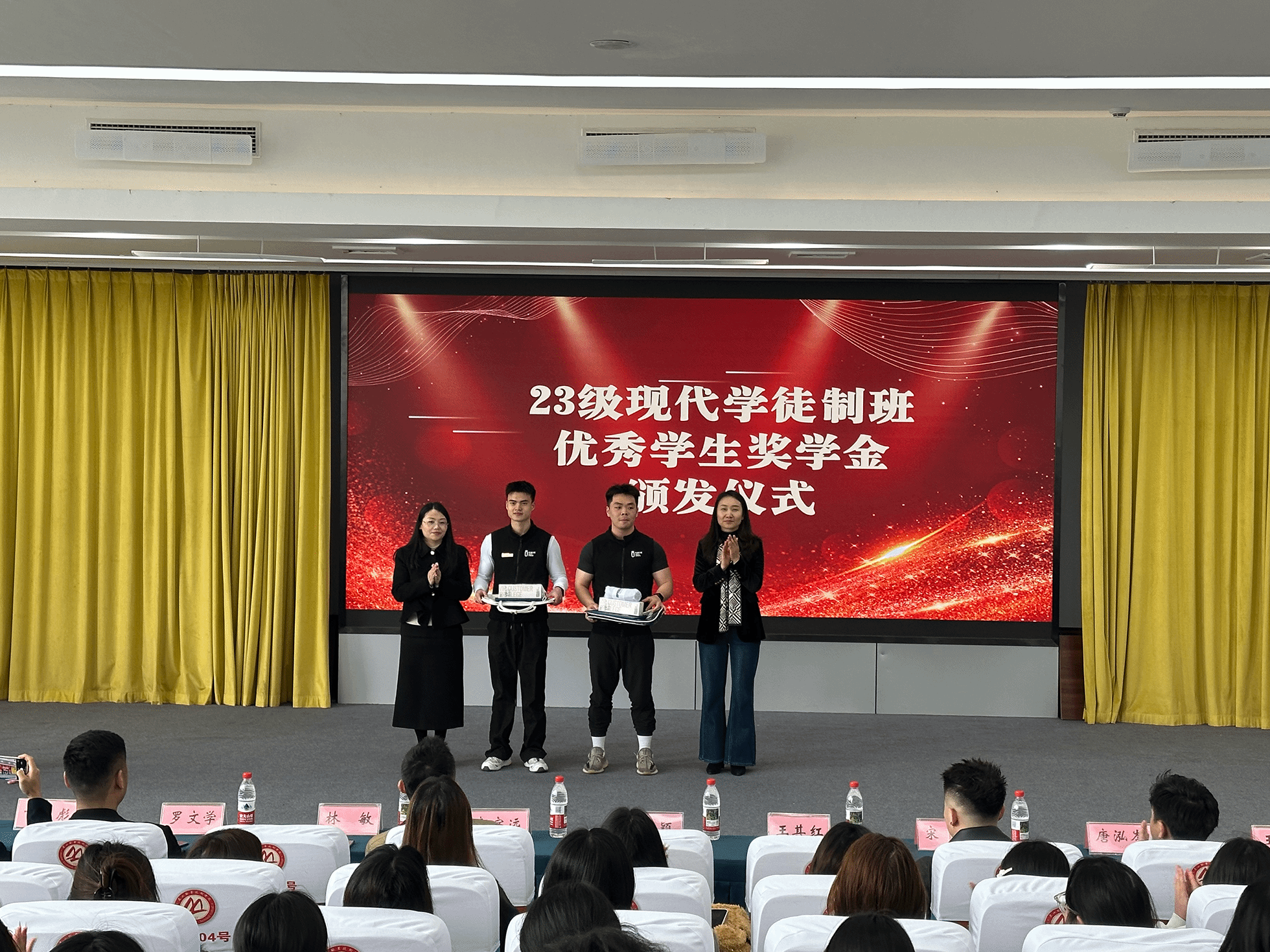 现场首先举行2023级现代学徒制班优秀学生奖学金颁发环节,对过去一学年中表现优异的学生进行表彰。学生代表谢涛、陈杰结合自身成长经历,分享了在校企协同培养模式下的学习收获与实践感悟,展现了产教融合育人机制取得的积极成效。