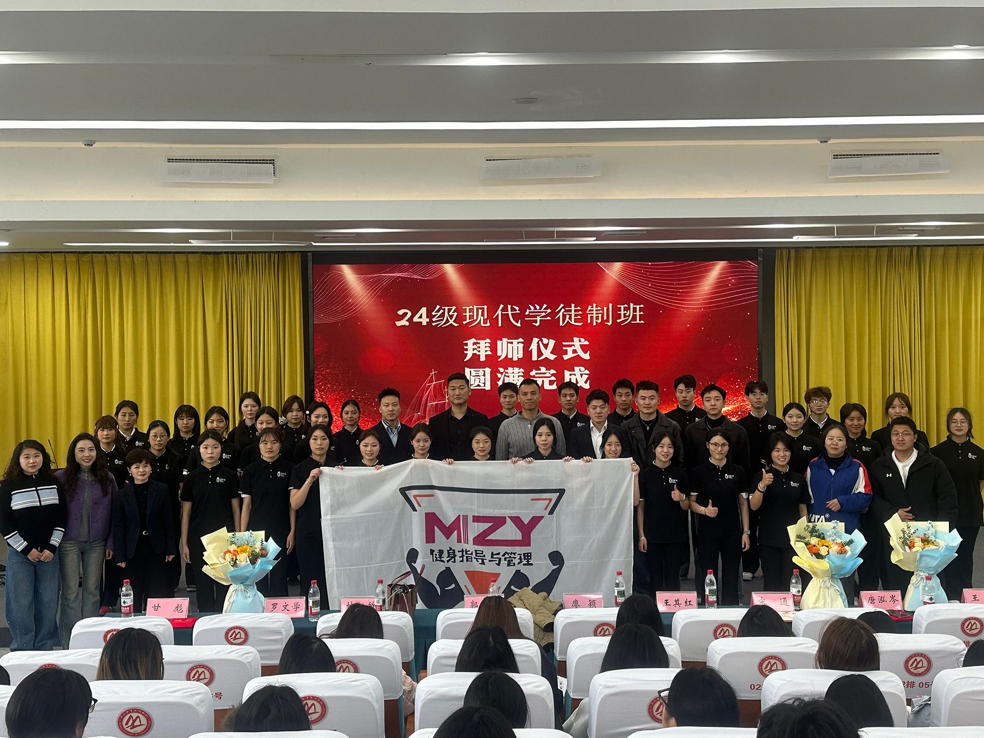 拜师仪式环节,来自乾坤乐健健身服务有限公司的企业导师依次上台,接受学生献花并完成拜师礼。仪式过程简洁庄重,体现了尊师重道、薪火相传的职业初心。