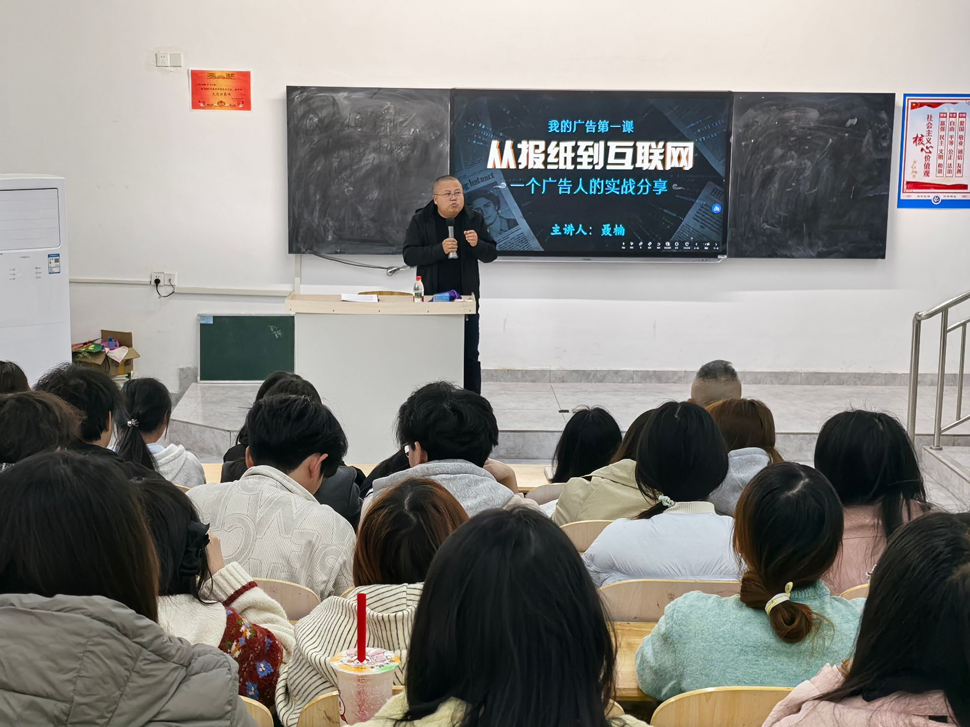 讲座中,聂楠结合多年行业经验,围绕本地广告与新媒体行业发展趋势、品牌推广实战策略、新媒体运营技巧等内容展开分享,通过真实案例深入解析文案策划、客户沟通、项目落地等核心技能。同时,他紧扣职场需求,为同学们系统讲解了广告人应具备的专业素养、求职技巧及职业发展路径,并详细梳理了广告行业的职业生涯规划与晋升脉络,帮助同学们明晰从初入职场的执行岗位到项目主管、总监等不同阶段的能力要求与发展方向,针对实习与就业提供了具体指导。在互动环节,同学们踊跃提问,嘉宾逐一耐心解答,现场气氛热烈。