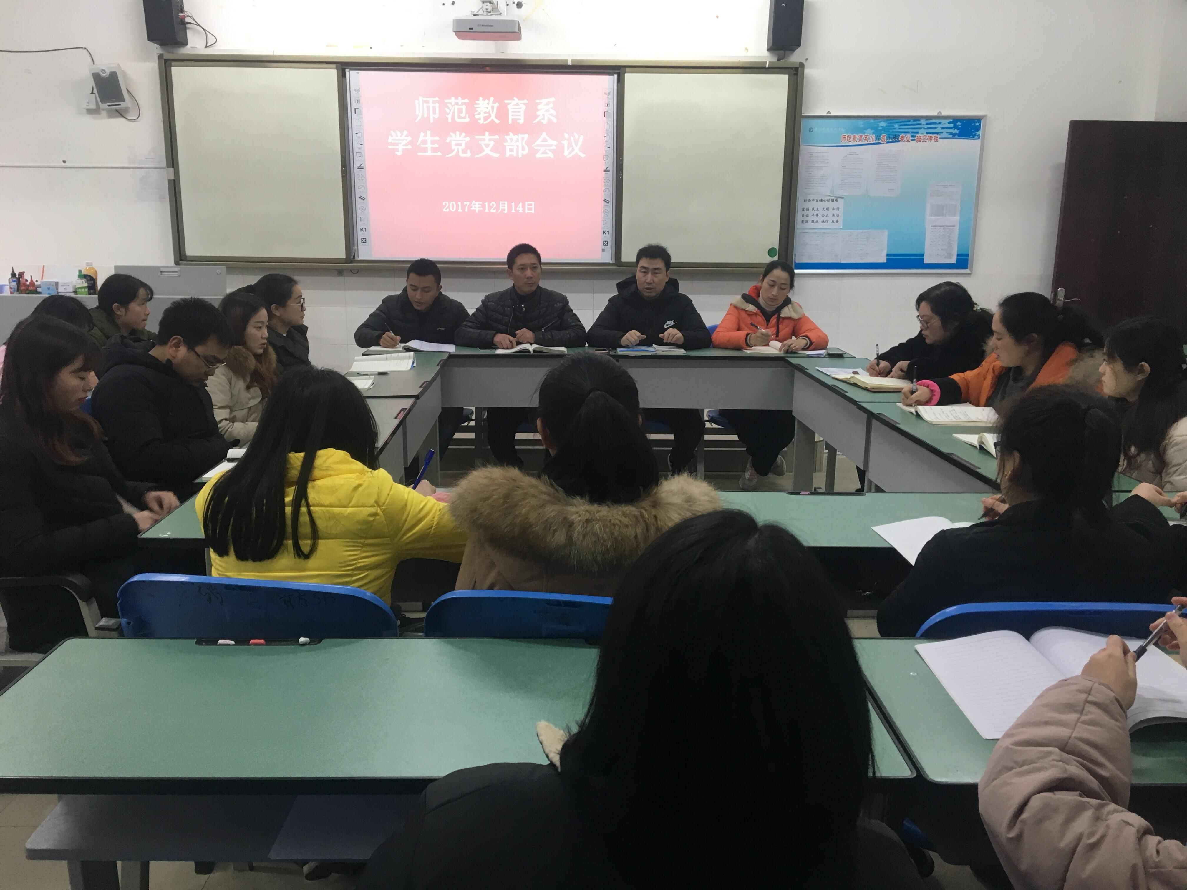 2017年12月14日下午,师范教育系学生党支部在1208教室召开接收预备党员大会,支部全体党员参加此次会议。会议由学生党支部书记李兴龙主持。