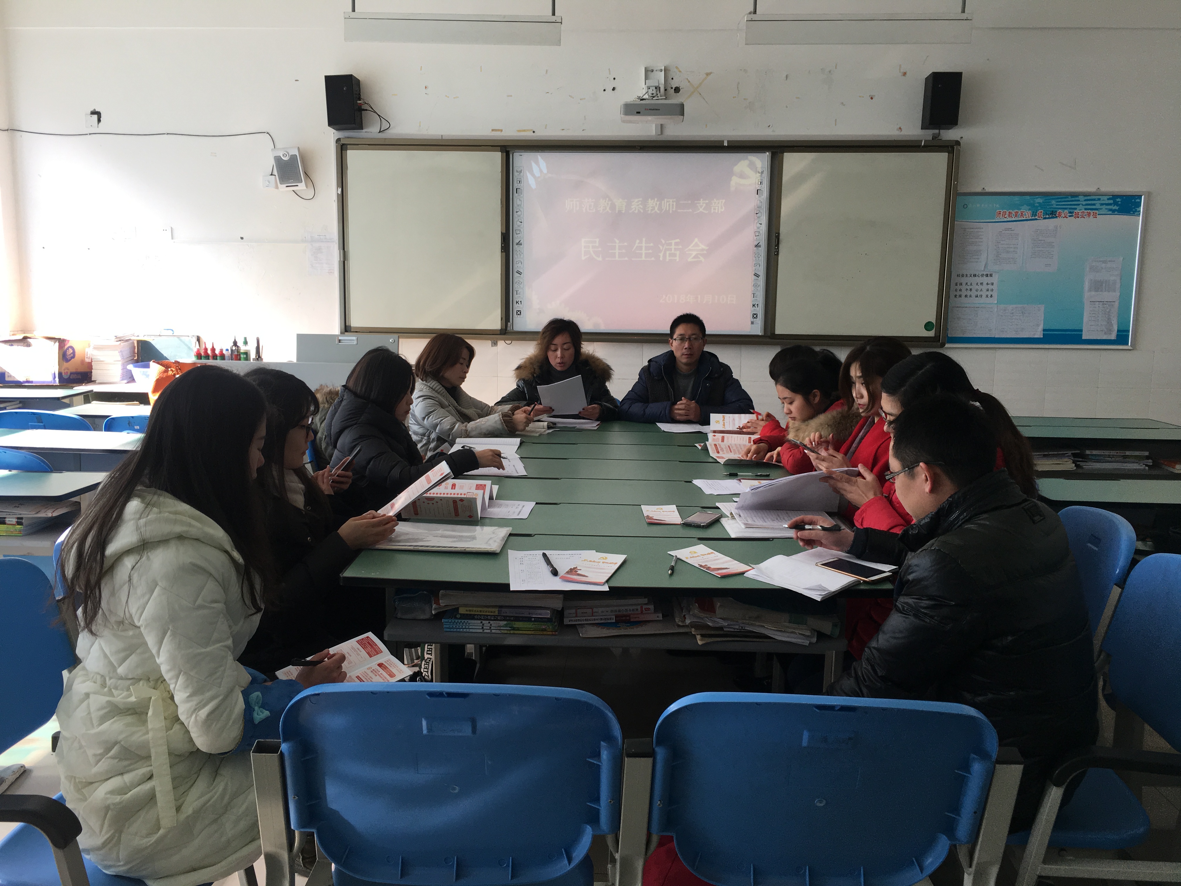1月18日中午,师范教育系教师第二党支部全体党员在1208教室召开了党员组织生活会。会议由党支部书记程雪主持,党总支书记丁盛应邀出席。