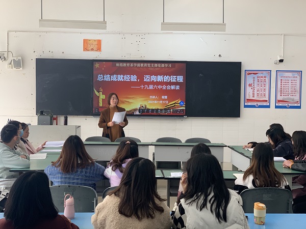 为认真学习贯彻党的十九届六中全会精神,更好地用全会精神武装头脑、指导实践、推动工作。11月17日中午,学前教育党支部书记程雪以“总结成就经验,迈向新的征程”为题,为全体党员讲授专题党课,学前教育党支部全体党员参加学习。
