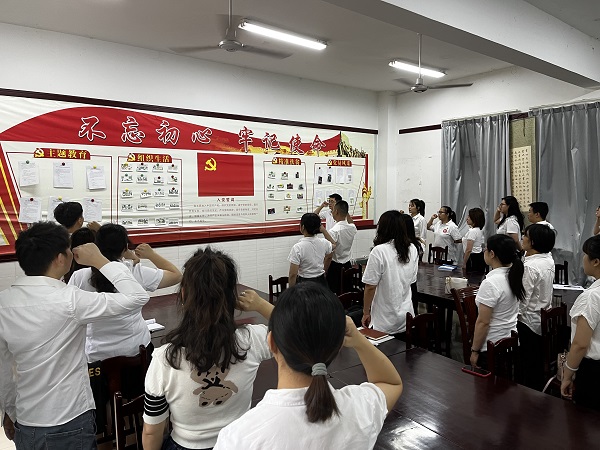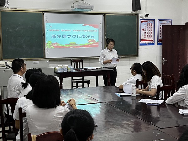 本次主题党日活动在全体党员声音洪亮的齐唱国歌中拉开序幕,全体党员举起右手、紧握拳头,在系党总支书记的带领下,新党员面对党旗庄严宣誓,老党员重温入党时的铮铮誓言,党员同志纷纷表示必将铭记一名党员的使命责任,坚定理想信念。同时,为勉励全体党员不忘初心,牢记使命,在教书育人的岗位上发挥好党员先锋模范作用,系党总支为党员过集体政治生日,并送上精美的政治生日纪念贺卡。陈思雨代表新发展党员作了表态发言,她质朴、真诚的入党感言感动了在场的每一名党员。