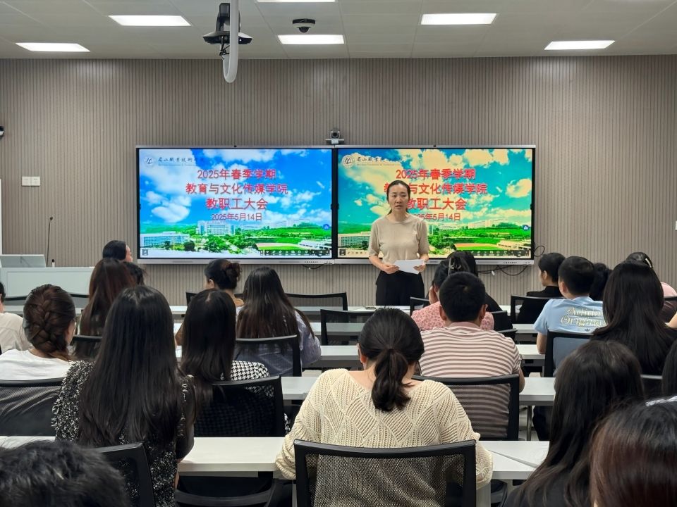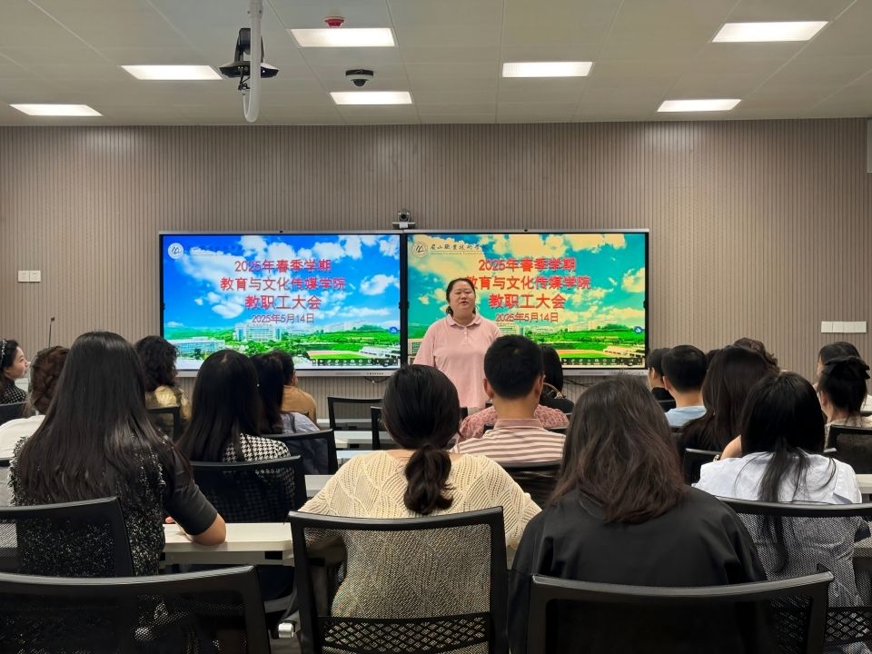 5月14日,教育与文化传媒学院在4303教室召开2025年春季学期教职工大会,会议由教育与文化传媒学院副书记廖颖主持、教育与文化传媒学院副院长黄艳参会。
