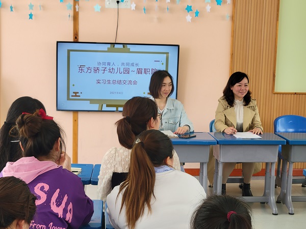 2021年4月22日中午1点,东方娇子幼儿园举行了19级眉山职业技术学院实习生总结交流会。会议由东方骄子陈园长主持,师范教育系带队老师李梅以及全体实习生参与会议。