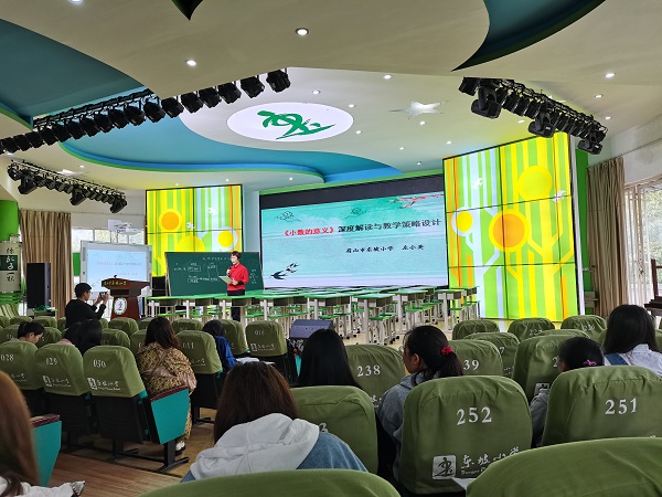 精彩的数学课堂和研讨结束之后,东坡小学数学教研组组长左小英向大家分享了一堂她精心准备的讲座,题为《小数的意义》深度解读与教学策略设计,讲座围绕教材解读、学生学情分析、教学设计与实施展开。