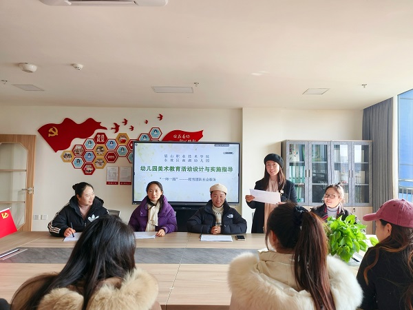 活动中,李福杰对程雪团队本年度开展的服务活动给予了充分的肯定。他表示,团队通过专项培训、集体教研、一对一指导等形式,使幼儿园教师的美术教学能力有了明显提升;在幼儿园日常环境创设和节日环境创设中,团队教师多次给予了中肯的建议并参与制作,在实践中切实指导幼儿教师提高了环创能力。随后,李福杰代表幼儿园全体教师对团队成员的付出表示衷心感谢,对我系推行“一师一园”社会服务项目举措表示高度赞扬,希望今后能继续深入合作,共同推动幼儿园发展。接着,程雪做了总结发言,并承诺会继续依据幼儿园需求开展服务活动,助力幼儿园师资能力提升。最后,程雪团队与美术工作坊成员对本学期的美术教学活动设计与组织情况进行了研讨,指出了需要持续改进的问题。