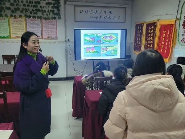 团队成员副教授王甜然以“幼儿园讲述活动设计与指导”为题向该园全体教师开展了讲座。讲座现场,她通过讲练结合的方式,运用案例视频分步讲解讲述活动的目标、分类和方法,帮助老师们理清讲述活动教学思路。随后,李梅团队进行了分组活动设计指导,团队教师甘婷婷、李梅分别加入幼儿园老师们的小组讨论,解答老师们在教学中的困惑和难点。培训结束后,老师们纷纷表示深受启发,学有所获。
