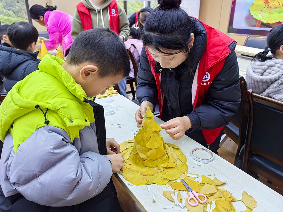 手工实践环节,孩子们在志愿者指导下制作“金菊映初心·铭记国难”主题作品。一朵朵金菊表达着对历史的追思与对和平的向往;“银杏叶女魔法帽”创作则融入季节元素,激发想象力,实现历史教育与审美教育的有机结合。