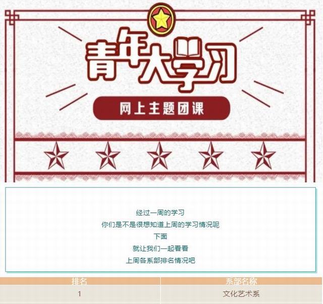文化艺术系把“青年大学习”作为广大青年学生扎实理论武装、强化思想引导的重要途径之一。从系部领导带领学工团队先学到学工团队进到班级讲学,成立学习小组,开展交流研讨,确保每一位学生每周学习、领会到位,进一步引导广大青年学生”不忘初心、牢记使命“, 切实增强”四个意识“、树立“四个自信”, 坚定不移听党话、跟党走。