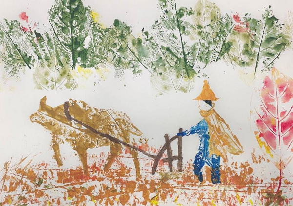 (树叶拓印画:春耕)