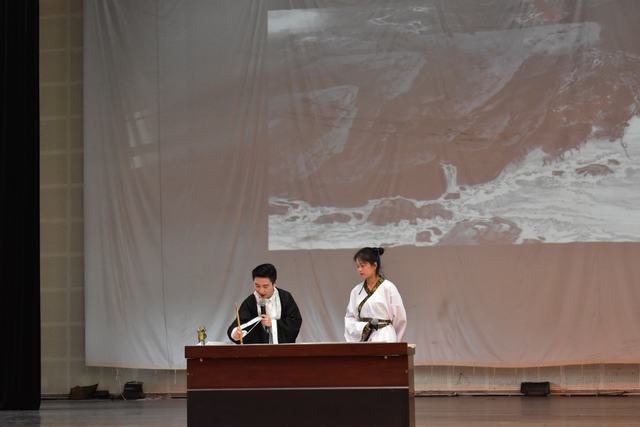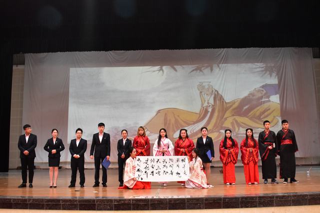 此次比赛,系上各班级先开展初赛,在初赛基础上选拔1-2个节目参加系上的复赛,经过选拔,全系15个班级推荐了22个节目参赛。比赛活动中,节目始终围绕“诵三苏经典”这个主题,结合情景剧、歌舞、书法、乐器等形式来表演,生动诠释了东坡文化的精髓。其中以15级英语1班结合专业特色的《有朋自远方来》表演形式尤为有特色,16级汉语1班孙宇等同学表演的《赤壁怀古》非常精彩,获得雷鸣般的掌声,该两个节目获得比赛的“一等奖”。