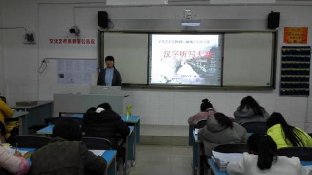 2016年3月14日晚,文化艺术系举行了2015—2016学年度下期“汉字听写大赛”的初赛,全系266名学生参加了此次比赛。此次比赛分班举行,由各班学习委员负责组织进行,系党总支副书记彭艳、系学生会学习部部长简至杨督促检查。