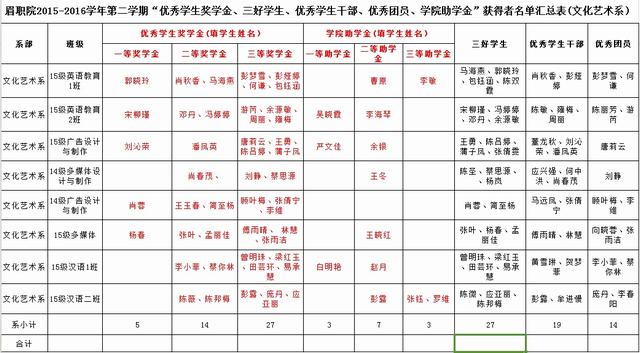 2、“文化艺术系2015-2016学年度上期的“院奖学金”、“院助学金”、“院三好”、“院优干”、“院优团”系初评名单