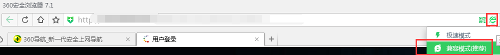 360安全浏览器切换到兼容模式,模式选择可以点击IE图标设置,如下图: