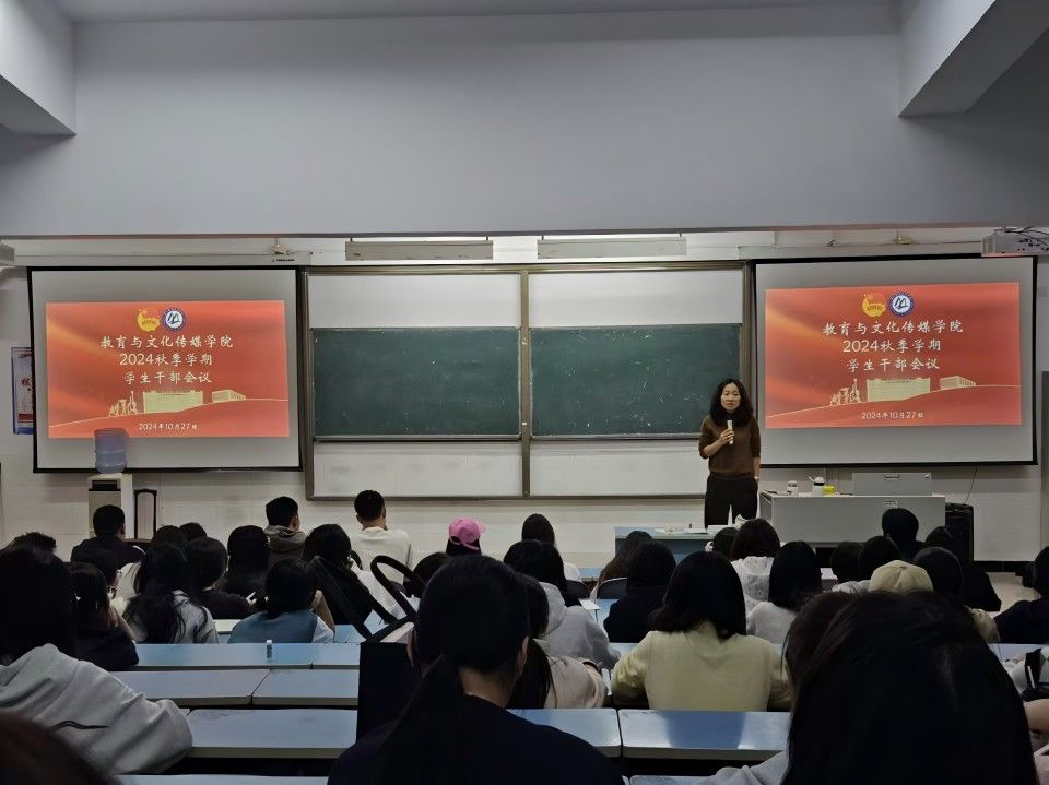 10月27日,教育与文化传媒学院在1102召开2024年秋季学期第一次全体学生干部例会。教育与文化传媒学院党总支副书记廖颖出席并讲话,学工秘书陈思雨主持会议,全体辅导员及学生干部参加。