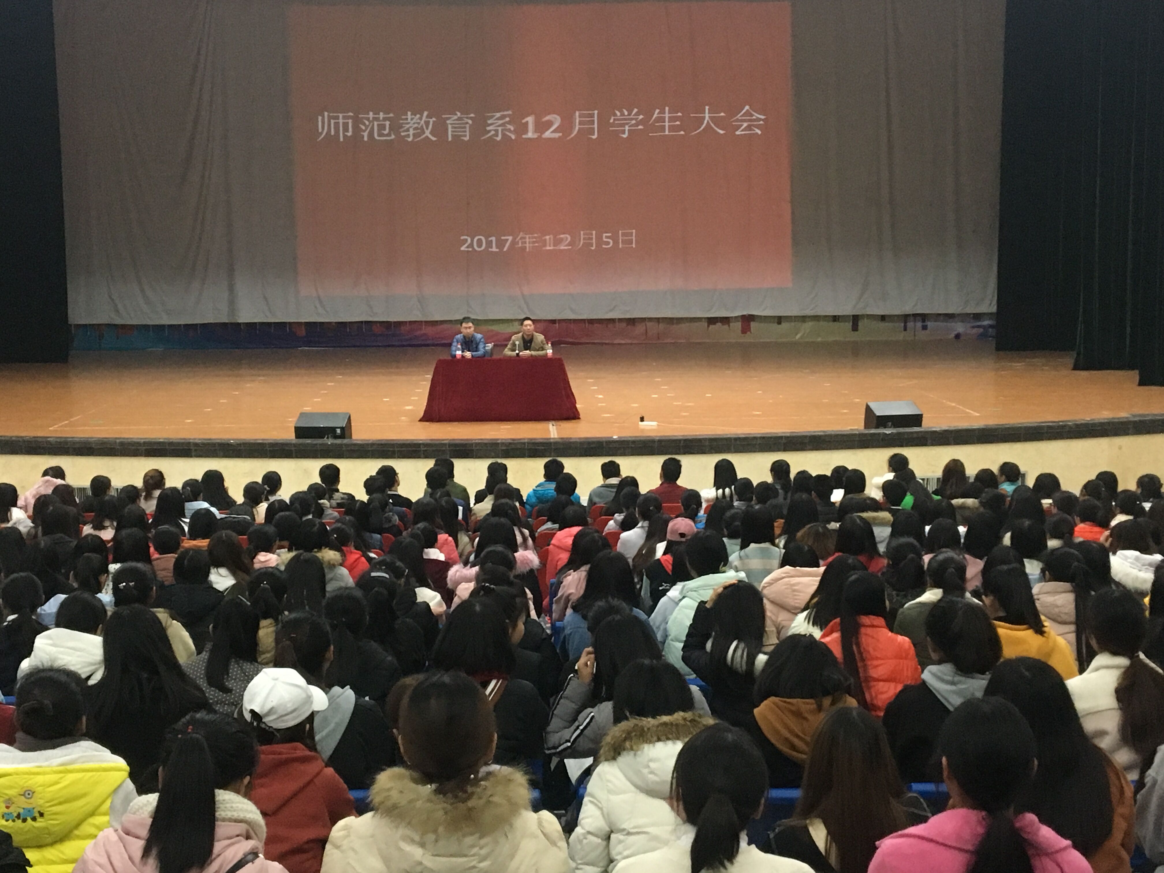 2017年12月5日晚,师范教育系在学院艺术中心召开了全系学生大会。系党总支书记丁盛、系学生科长李兴龙、学生管理人员和全体学生参加了此次大会。