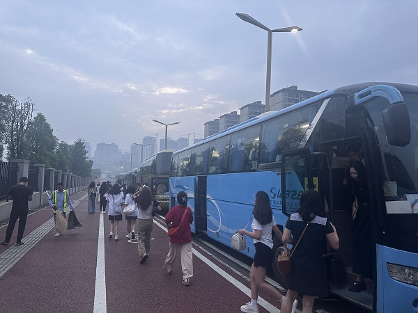 早晨7点,14辆接送学生的车辆搭载500余名考生在校门口集合准时出发,辅导员徐佳忆、张琦悦、李磊、杨超雄为分布在眉山东坡区、仁寿考点的学生爱心送考,老师们全天候在线,一丝不苟地做好考试学生的思想关注、心理关爱、热忱服务等工作,传递着师范大家庭的温暖。