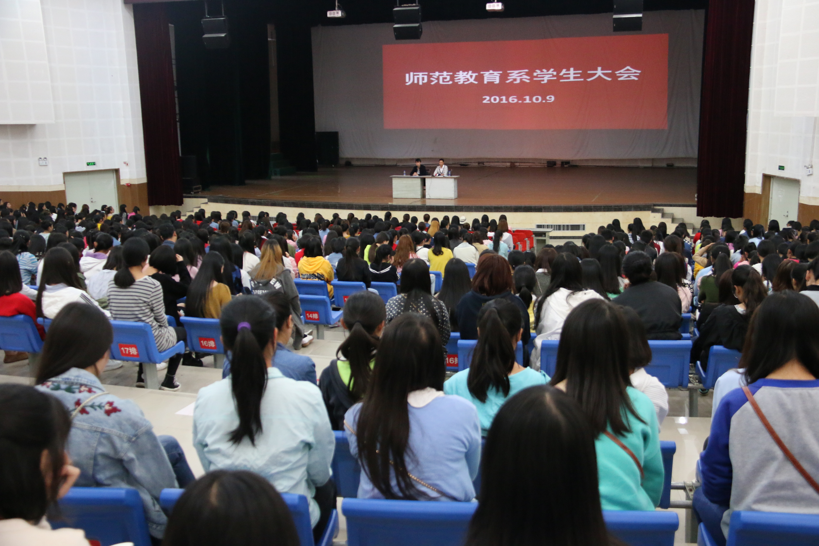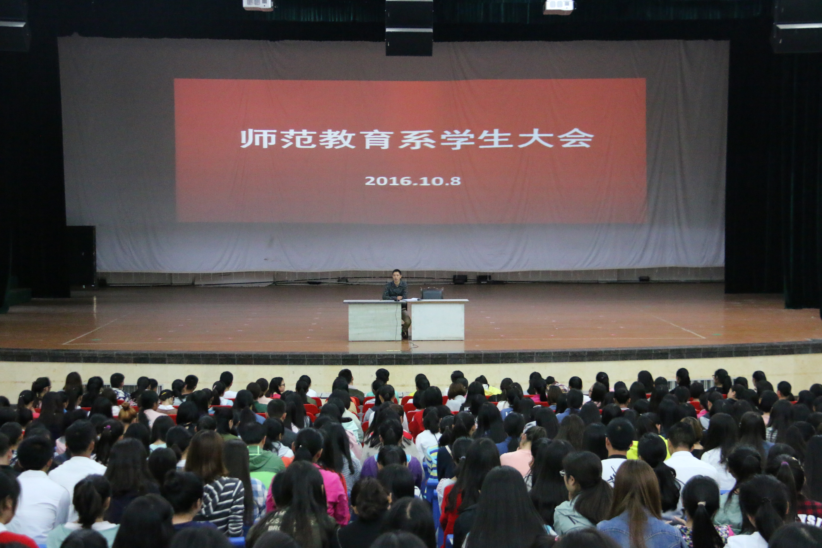 2016年10月8日和9日下午,师范教育系在艺术中心分别召开了小学教育和学前教育的10月学生大会,会议由师范教育系学生科长李兴龙主持,系党总支书记丁盛、全体学生管理人员和学生参加了此次会议。