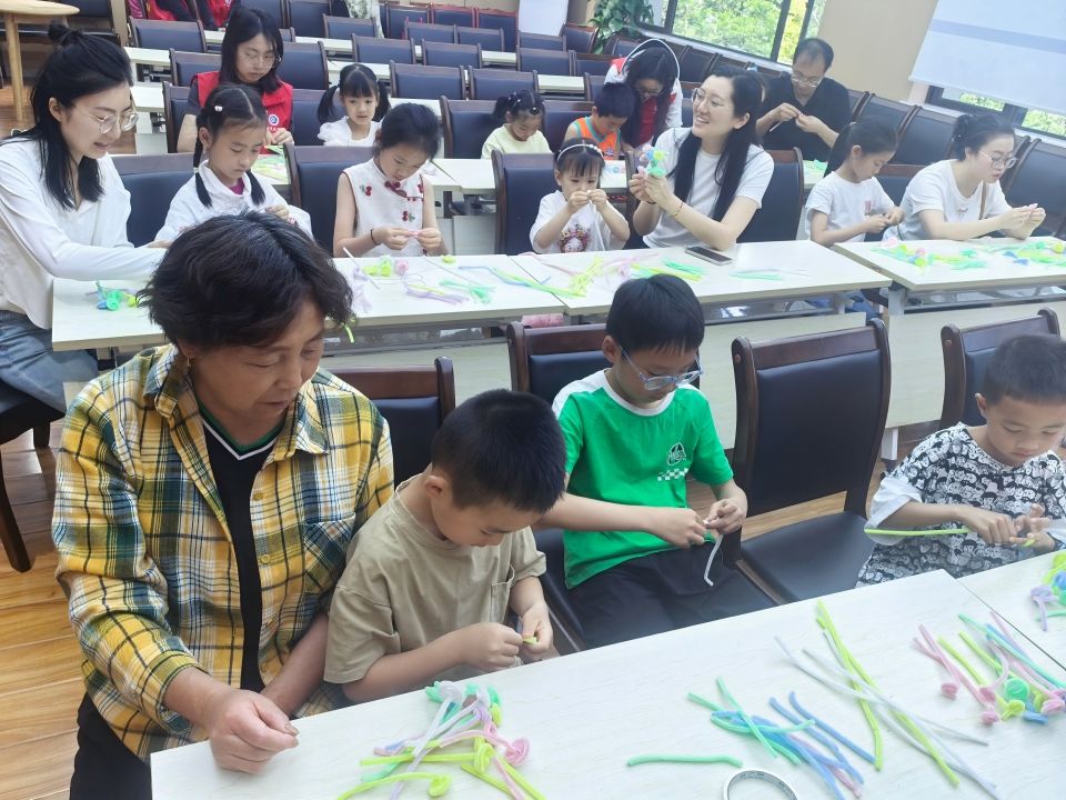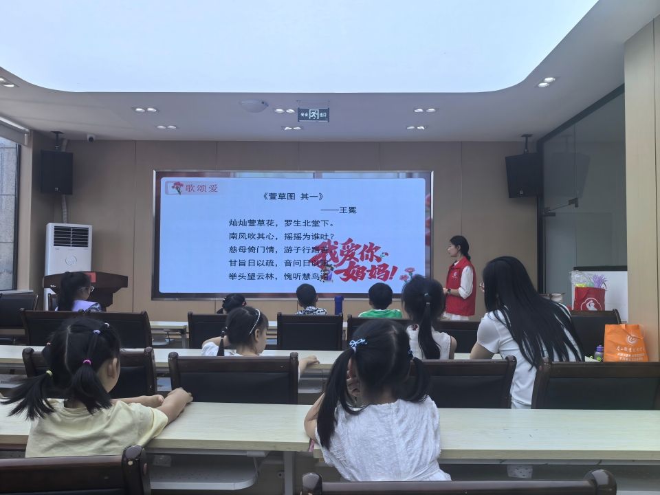 活动现场,志愿者通过PPT向孩子们介绍了母亲节的历史与文化意义,并分享了程夫人与苏轼的经典故事,从心理学角度分析了母亲教育对孩子成长的重要性。随后,孩子们在古诗《萱草图 其一》的赏析中,感受诗中蕴含的母子情深,并通过语言表达了对母爱的理解与感恩。手工制作环节将活动推向高潮。在志愿者的指导下,亲子家庭共同制作扭扭棒花束。孩子们专注地扭动手中的材料,家长们则在一旁耐心协助,现场充满了欢声笑语。活动结束,孩子们展示了亲手制作的花束,并送上对母亲的祝福,温馨的场景令人动容。