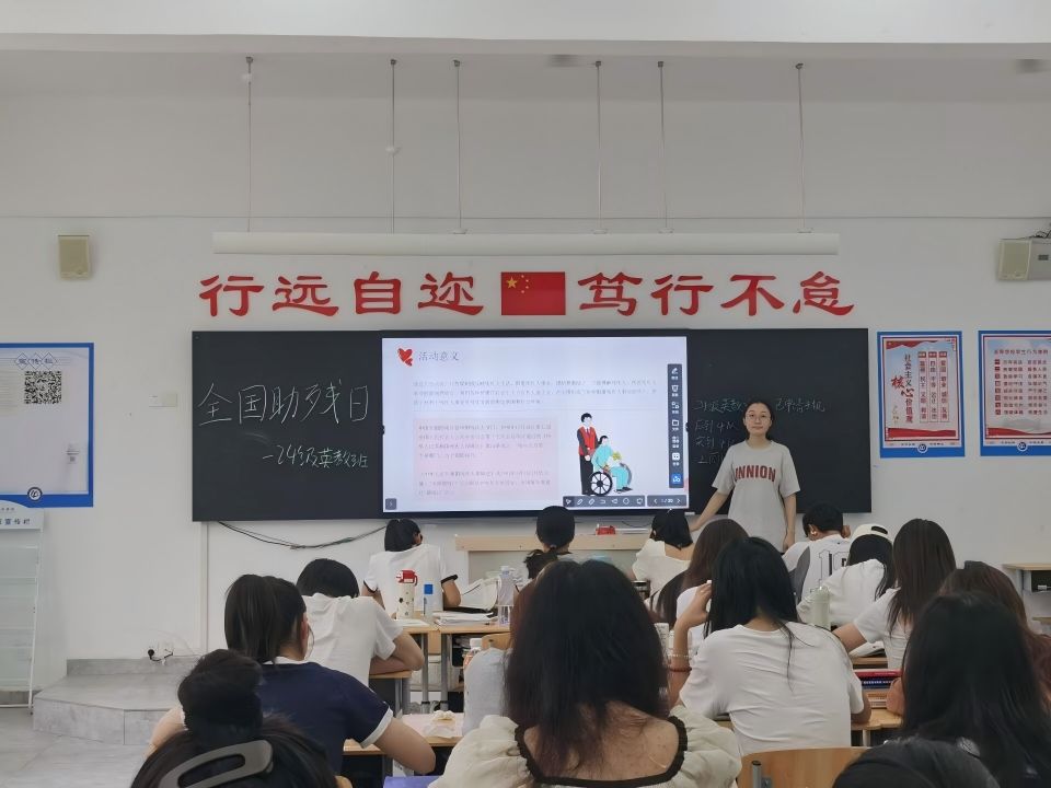 在讨论分享环节,现场气氛热烈。同学们踊跃发言,纷纷表示此次班会让自己深刻认识到助残需融入日常生活。部分同学结合小学英语教育专业特色,提出可发挥专业优势,为残疾儿童设计英语趣味教学活动。大家一致表达了以实际行动关爱残疾人的坚定决心。