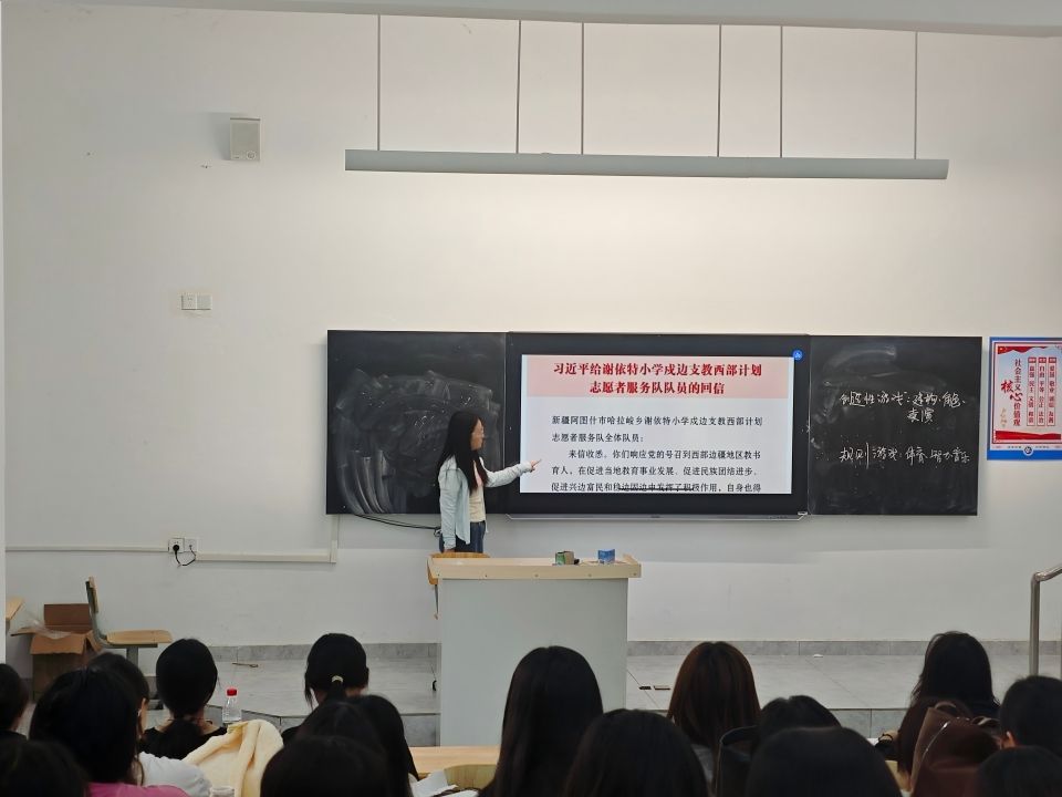 活动中,各班团支部书记通过图文展示、视频展播等形式,详细讲述谢依特小学戍边支教志愿者服务队扎根边疆、奉献教育的感人事迹。这支青年队伍积极响应党的号召,在西部边陲地区深耕教学一线,不仅推动当地教育事业发展,更在促进民族团结、助力兴边富民与稳边固边工作中发挥重要作用,以实际行动诠释新时代青年的责任与成长。