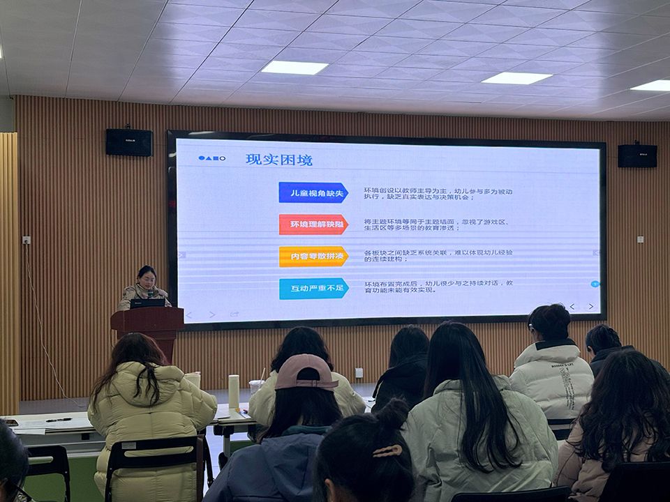 随后,杨秋菊老师作题为《儿童视角下的“对话式”主题环境创设实践研究》的案例分享,针对当前幼儿园环境创设中儿童视角缺失、互动不足等现实困境,提出以“对话”为核心的环境育人新路径。她强调从“为儿童创设环境”转向“由儿童创设环境”,推动幼儿成为环境的主动建构者。