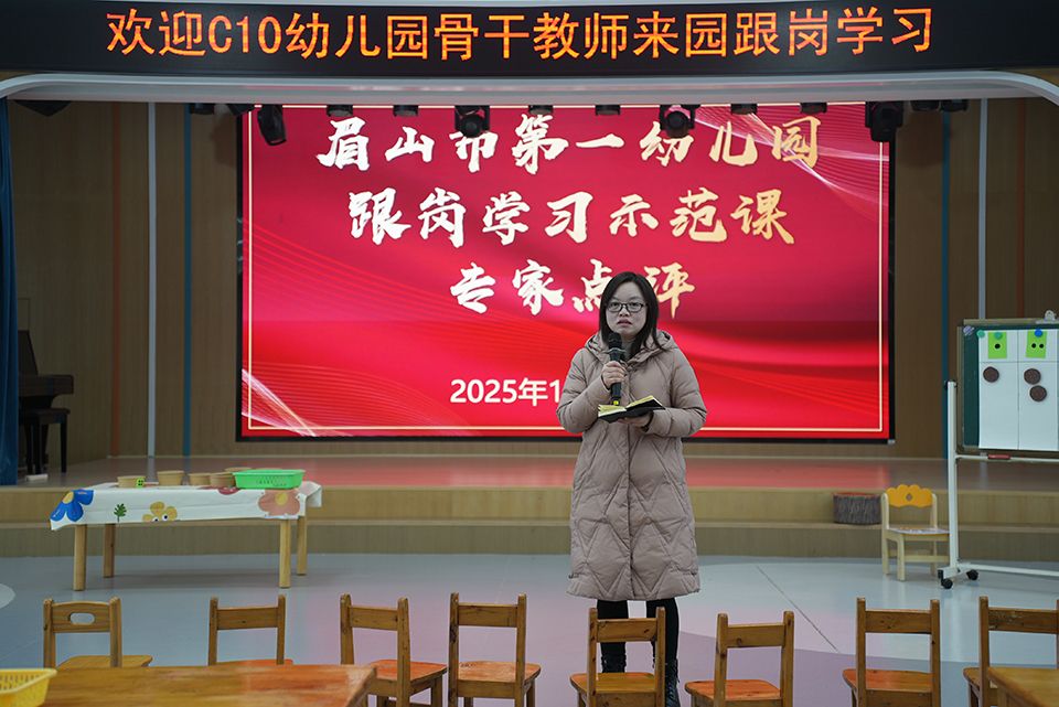 12 月 26 日,市内名园跟岗学习第二组进入了眉山市第一幼儿园,开启了第三天的跟岗学习。为持续提升教师集体教学活动的设计与实施能力,通过“在研磨中改进、在展示中锤炼、在点评中明晰”引导教师在真实教学情境中深度参与、互动研讨,实现专业能力的有效进阶,为教师持续提升集体教学活动质量奠定了扎实基础。