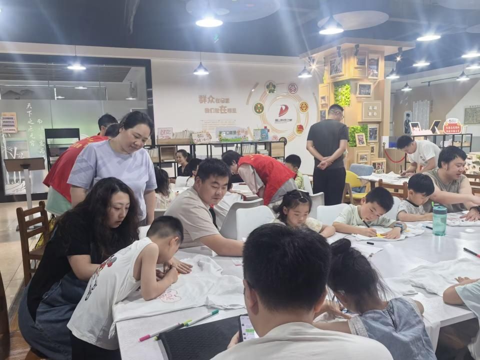 手绘T恤环节成为活动的高光时刻。志愿者为每个家庭分发白色T恤、纺织颜料和画笔后,亲子间即刻展开创意协作。孩子们将对父亲的爱意融入笔触:有的用蓝色系勾勒父亲宽厚的背影,有的用缤纷色彩描绘全家出游的温馨场景,更有小朋友将动画角色融入创作,童趣与创意交织。志愿者穿梭其间,耐心指导绘画技巧,鼓励亲子共同设计,现场洋溢着温暖的创作氛围。