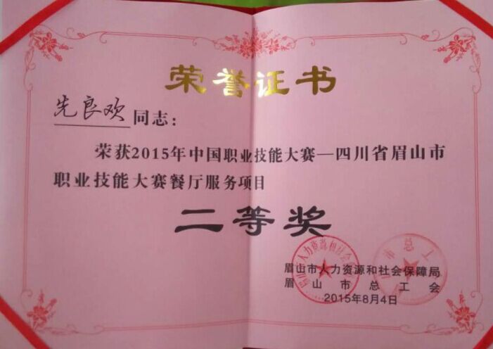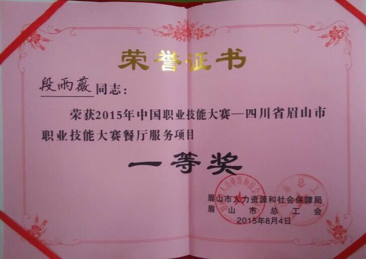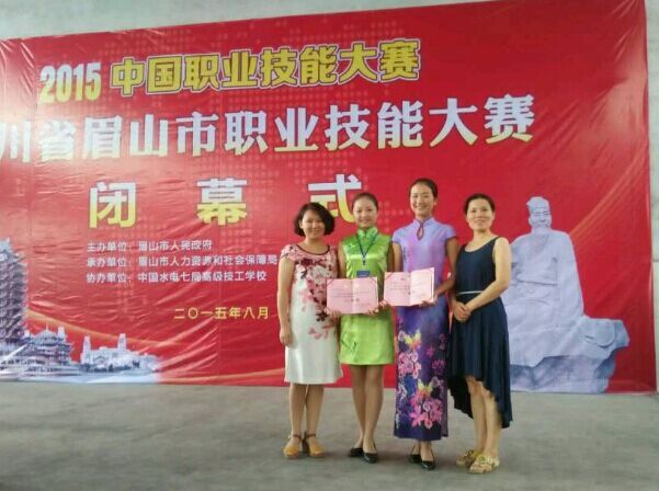2015年8月3日,商贸旅游系14级酒店专业学生段雨薇、先良欢在彭山区中国水电高级技工学校参加眉山市职业技能大赛餐厅服务技能竞赛,分别获得第一名、第二名的好成绩。