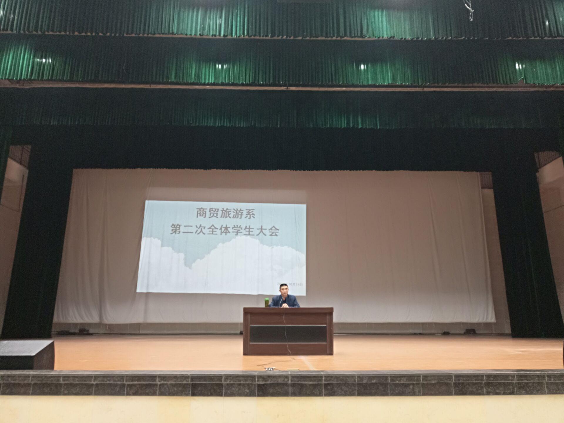 10月14日晚,商贸旅游系在艺术中心召开了2018-2019学年度第二次学生大会。出席本次会议的有商贸旅游系党总支书记彭瑞清、团总支书记李一民、全体辅导员以及商贸旅游系924名学生。