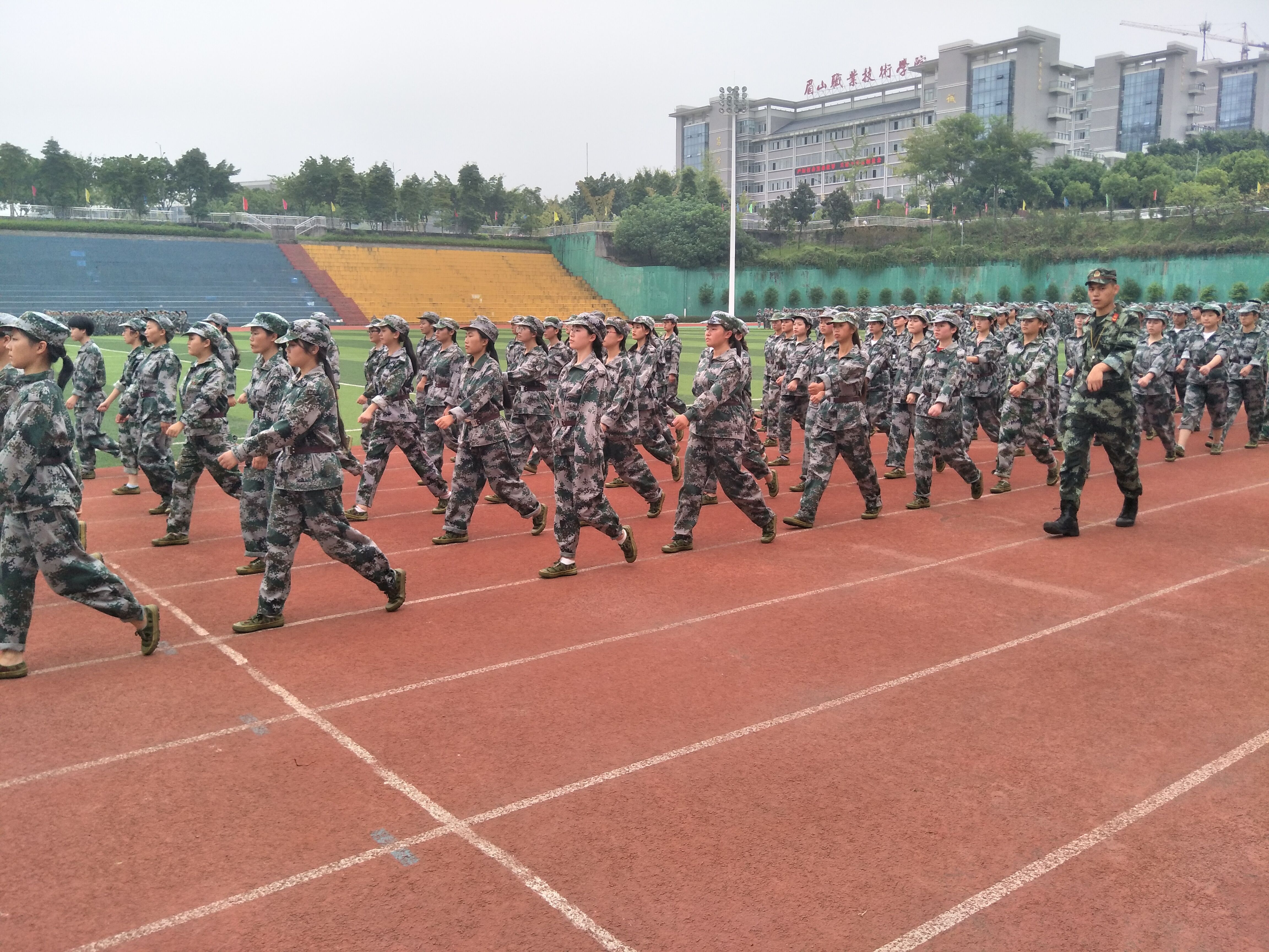 一身绿装把宠儿从平日的“温室”带到了军令如山的训练场上,带走了他们的娇气与懒散,赋予了他们精神与力量,她们在教官的带领下进行着齐步,正步的操练,教官要求新生们先练分解动作,胳膊、腿都要在一条线上,不能高低不平,大家都认真地按照教官的指示去做,摆臂抬腿有力到位,从刚开始的我行我素,到后来的团体意识,每一步都是新生们的成长。为期五天的军训已过大半,比起往年的军训她们确实一群幸运儿,因为他们得到了天时与地利。但是比起往年质量依然是毫不逊色。她们依旧斗志昂扬,立正、稍息、摆臂、踏步一个个动作展现着新生们的精气神,操场上各个方队的脚步整齐划一,掷地有声。军训不仅仅是对行为的训练,更是对精神和思想的一种升华,军训使同学们少了一份依赖,多了一份自立,培养了同学们艰苦奋斗的精神。