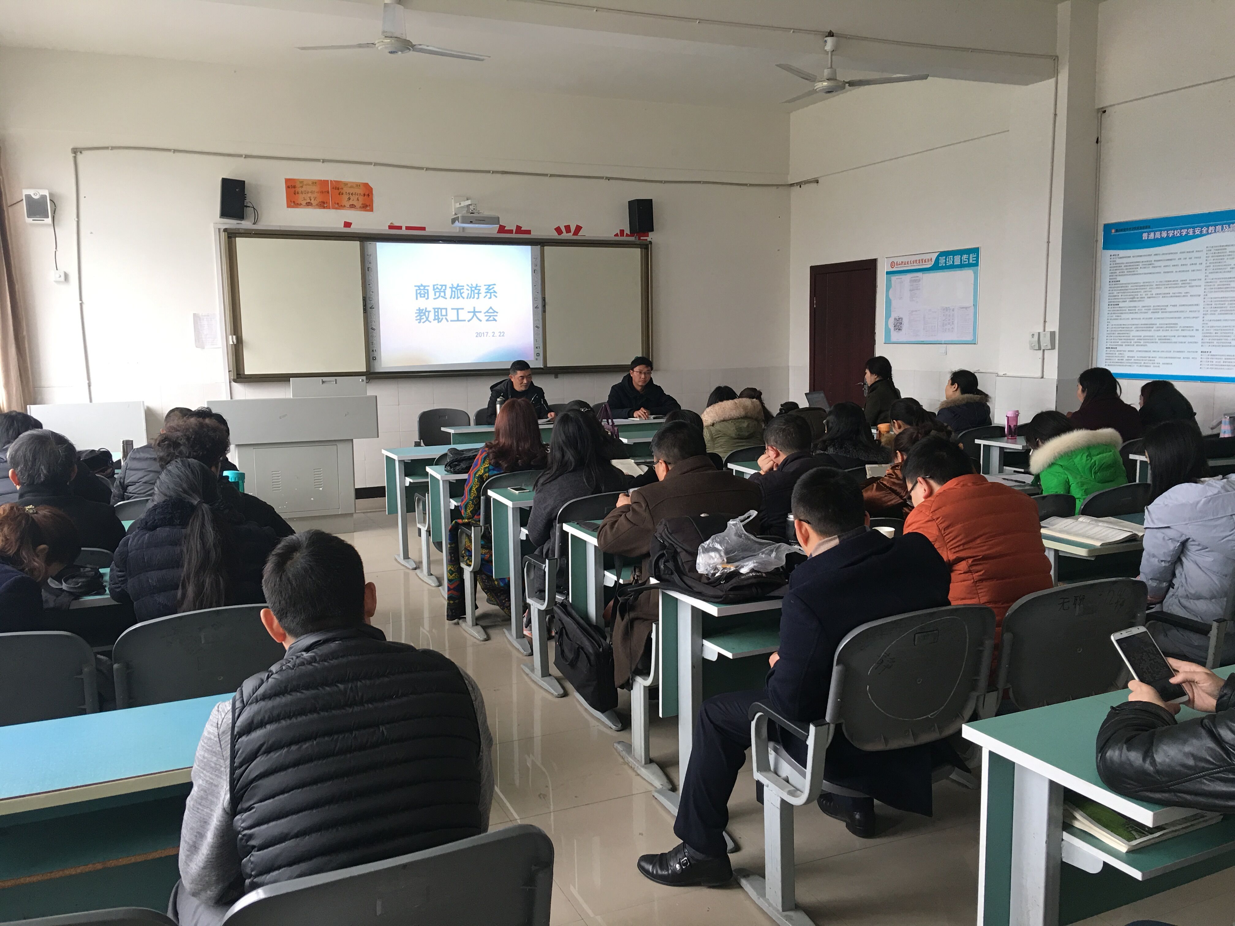党总支副书记(主持工作)、副主任杨光辉向全体教职工传达了2017年第一次干部党员大会精神,宣读了《商贸旅游系2017年度党建工作责任书》,要求教师党支部、学生党支部要明确各自的职责所在,及时跟进学院的发展步伐,按照责任书的要求,开展各项工作。