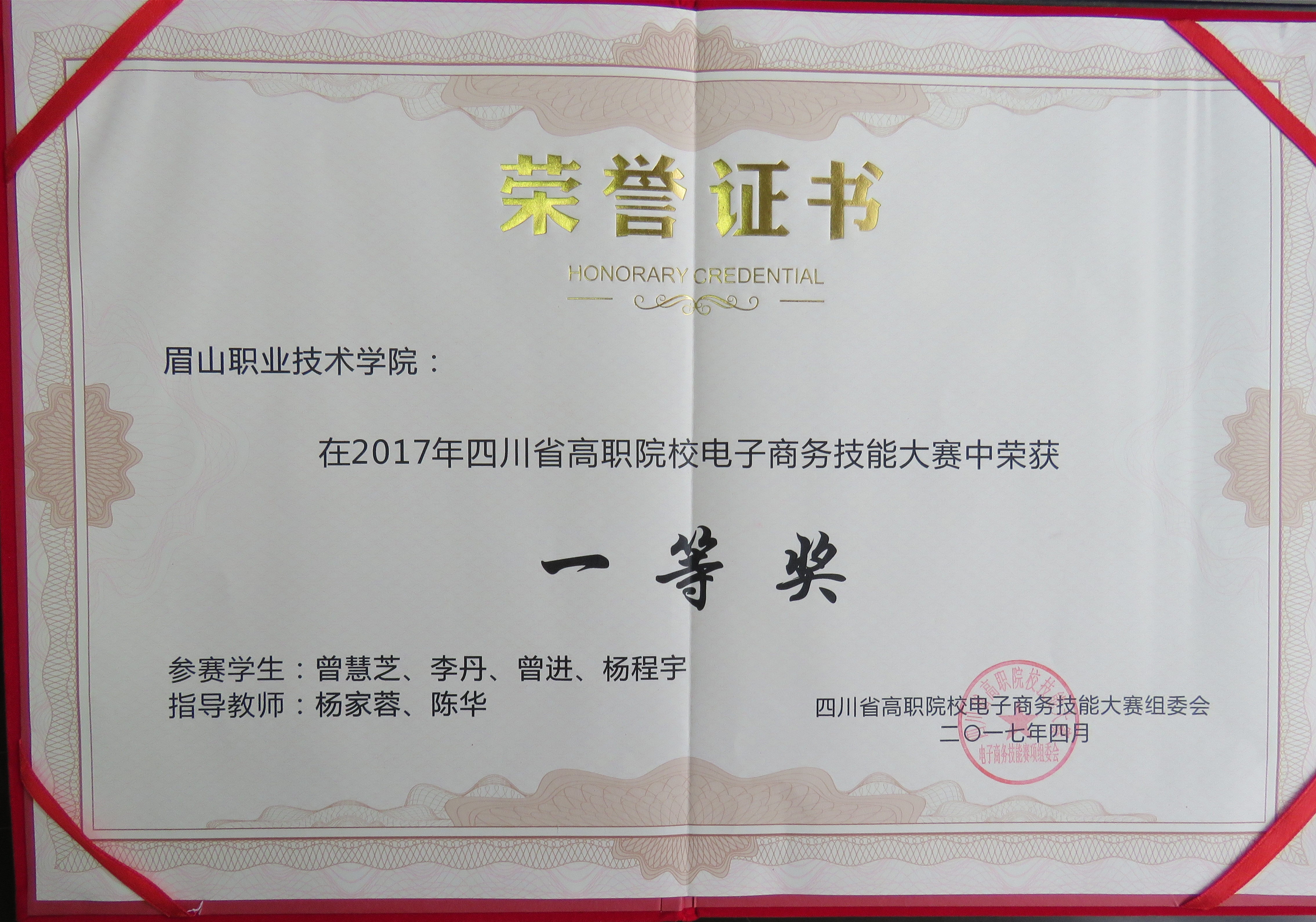 商贸旅游系商贸教研室老师指导的电子商务团队参加四川省高职院校电商技能大赛,与33所高职代表队同台竞技,经过客户服务、网店装修、网店营销等多个环节的比拼,荣获团队一等奖,代表四川省参加国赛。