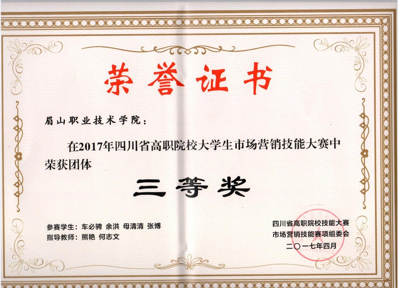 商贸旅游系商贸教研室老师指导的市场营销团队参加四川省高职院校营销技能大赛,与38所院校(含两所本科院校)代表队同台竞技,经过市场预测、行情分析、目标市场选择、竞争对手分析、产品价格制定、促销、分销策划等项目的初赛和决赛,获团体三等奖。