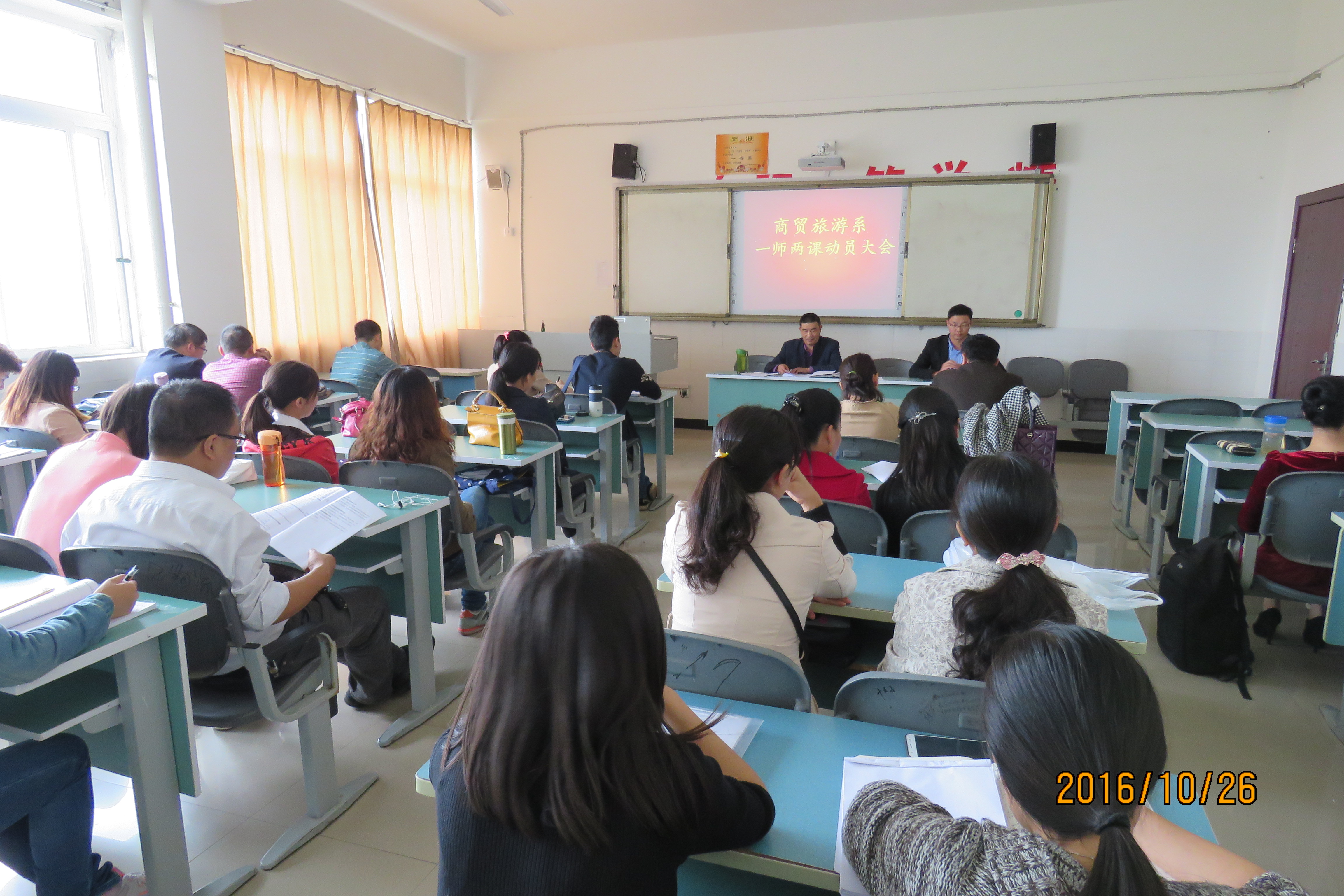 2016年10月26日,为落实眉山职业技术学院关于《“一师两课”教改行动实施方案》的通知文件精神,进一步更新教师的教育教学观念和提升教师执教能力,商贸旅游系在1411教室开展了推进“一师两课”行动计划动员大会。此次动员大会由商贸系主任彭瑞清主持,商贸旅游系全体教职工参加。