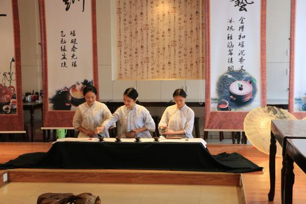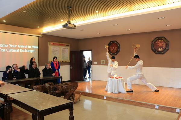 在云水禅心,婉转幽远的音乐声中,同学们向外国友人展示了以东坡文化为特色的长嘴壶茶艺、温婉雅致的眉州茶语。首先陈书凡、秦盼手持长嘴壶,行云流水般地表演了“云龙扣月”、“青龙入海”、“游龙戏水”等一系列高难度动作,随后段雨薇、夏雨清、王艺馨踩着音乐节拍,优雅地表演了烫杯、置茶、润茶、冲泡、品茗等专业茶技。整场表演赢得外国友人的高度评价,博得了现场所有人的掌声。