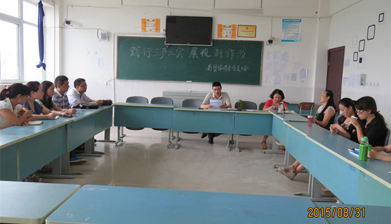 8月31日上午,商贸旅游系党总支在1409教室召开以“践行三严三实,展现新作为”为主题的新学期党员大会,安排布署思想政治学习、践行三严三实,梳理查找不严不实问题等党建工作任务。会议由商贸旅游系党总支副书记(主持工作)杨光辉主持。