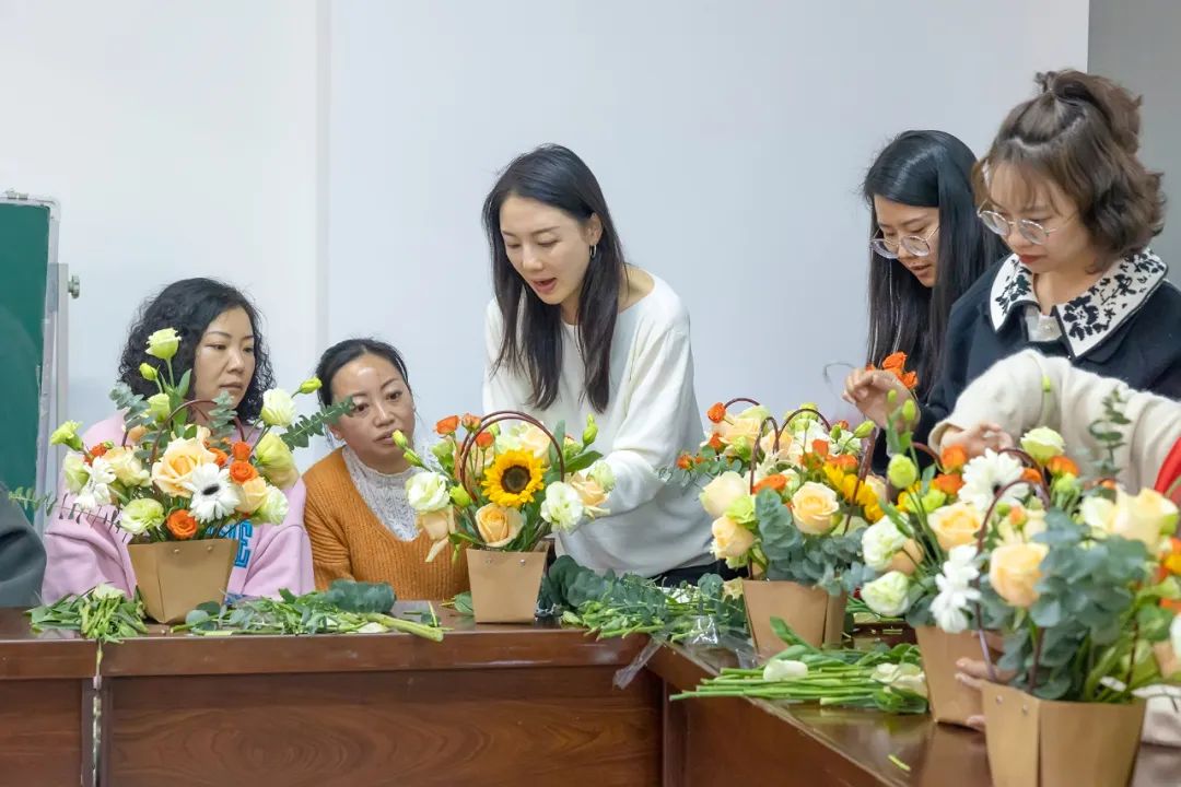 活动由我院教师王娓娓担任主讲,她结合插花艺术的基本技巧、色彩搭配以及花材的选择等内容,分享了花艺在琐碎日常中存在的意义,为女性朋友们带来了一堂生动的花艺课。