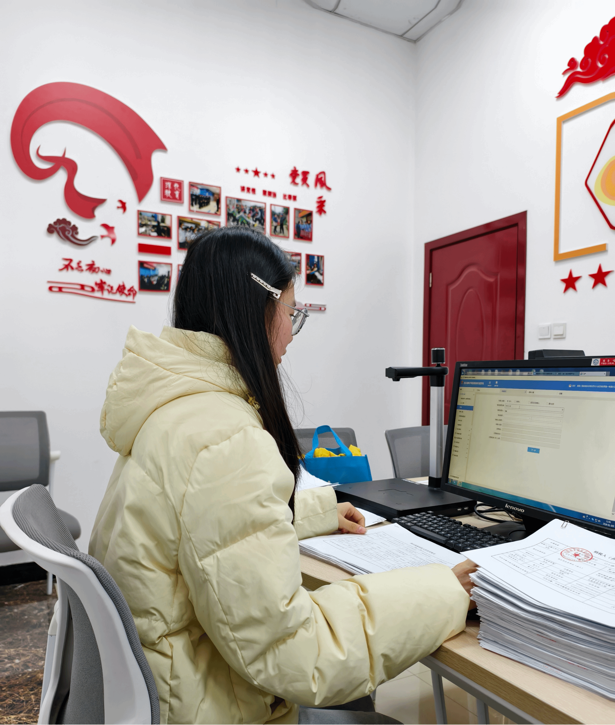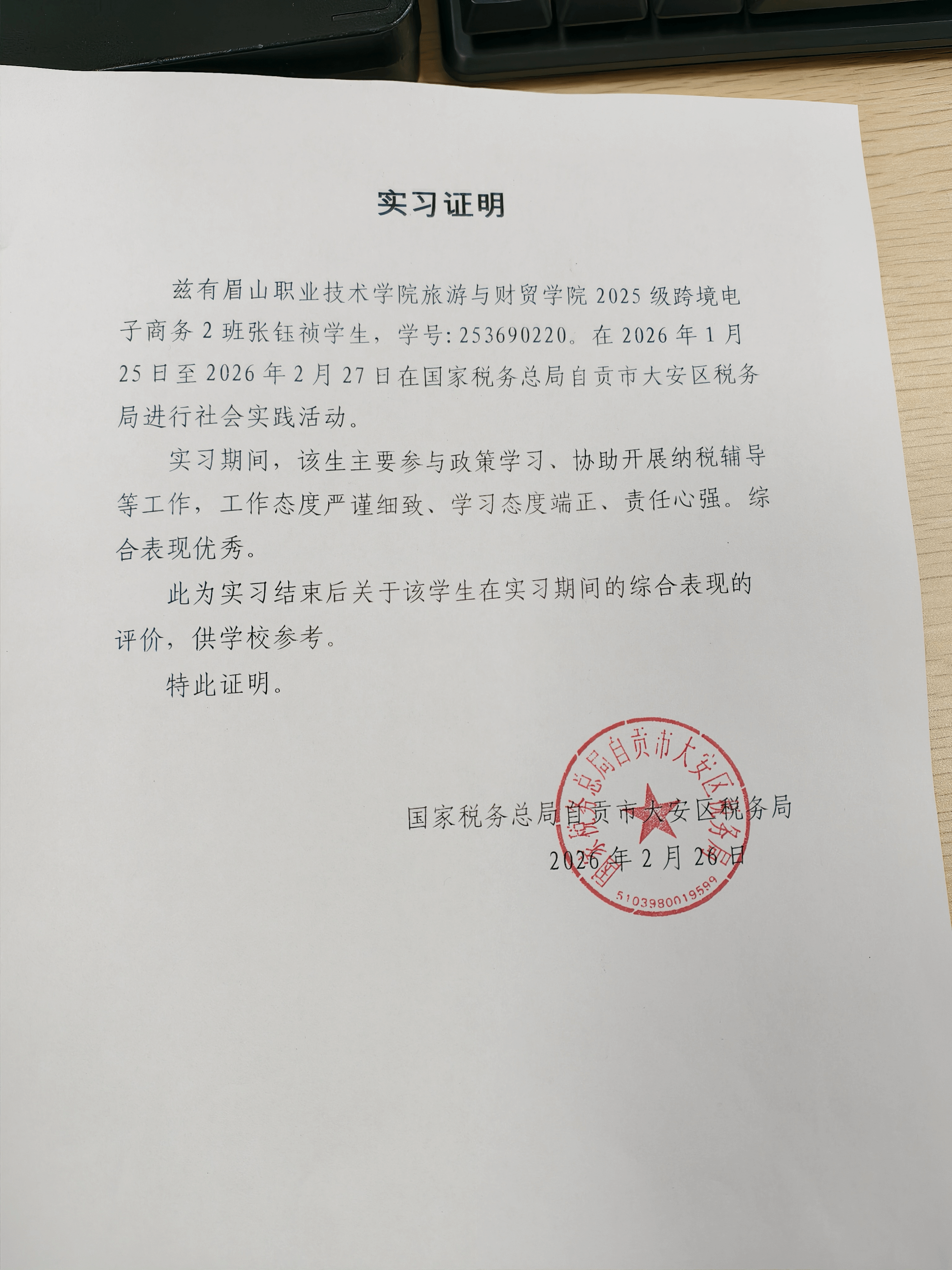 张钰祯,2025级跨境电子商务2班学生。张钰祯在返回家乡自贡市后,走进国家税务总局自贡市大安区税务局,开启实践之旅。在办税服务厅,她的日常工作从扫描资料开始—每天经手百余份纳税人提交的发票、申报表和营业执照,她需要逐一分类、扫描上传,确保每一份纸质资料清晰完整地存入电子档案系统,在同事的指导下,她逐步熟悉金税系统的操作流程,学习如何办理纳税申报、缴纳税费等基础业务。空闲时间,她主动翻阅政策手册,了解小微企业税收优惠、农产品免税政策等与乡村振兴息息相关的事务,从中感悟到党和政府对乡村振兴事业的真情关注,也学到了很多业务知识。