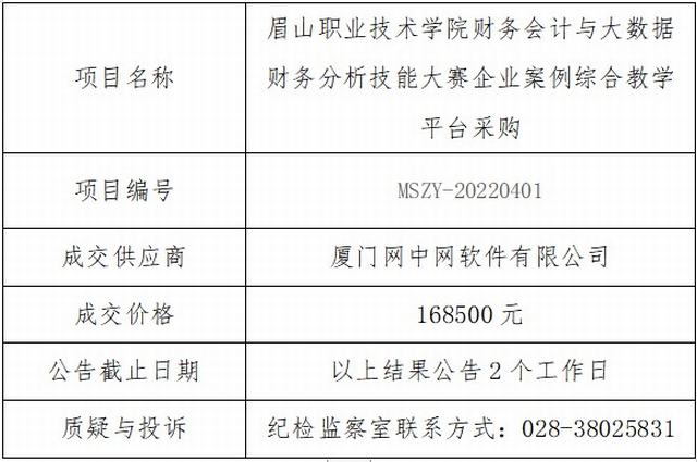 眉山职业技术学院财务会计与大数据财务分析技能大赛企业案例综合教学平台采购竞争性谈判结果公告