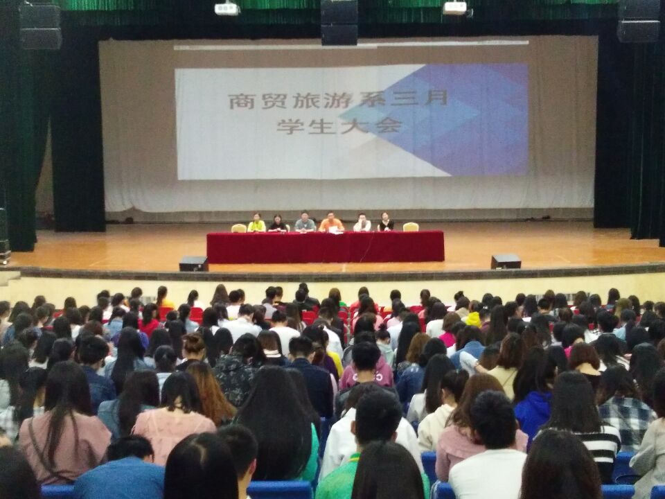 2018年4月1日晚,商贸旅游系在艺术中心召开了2018年3月份学生工作总结大会,商贸旅游系党总支副书记(主持工作)杨光辉、全体学管人员和在校800余名学生参加了会议,会议由商贸旅游系团总支书记李一民主持。