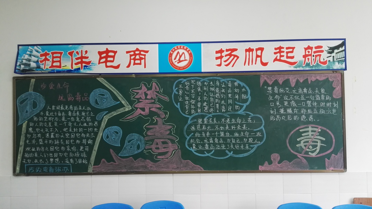2017年3月,商贸旅游系15级、16级电子商务、市场营销、物流管理等专业在各班教室开展了以“禁毒教育”为主题的黑板报设计活动。