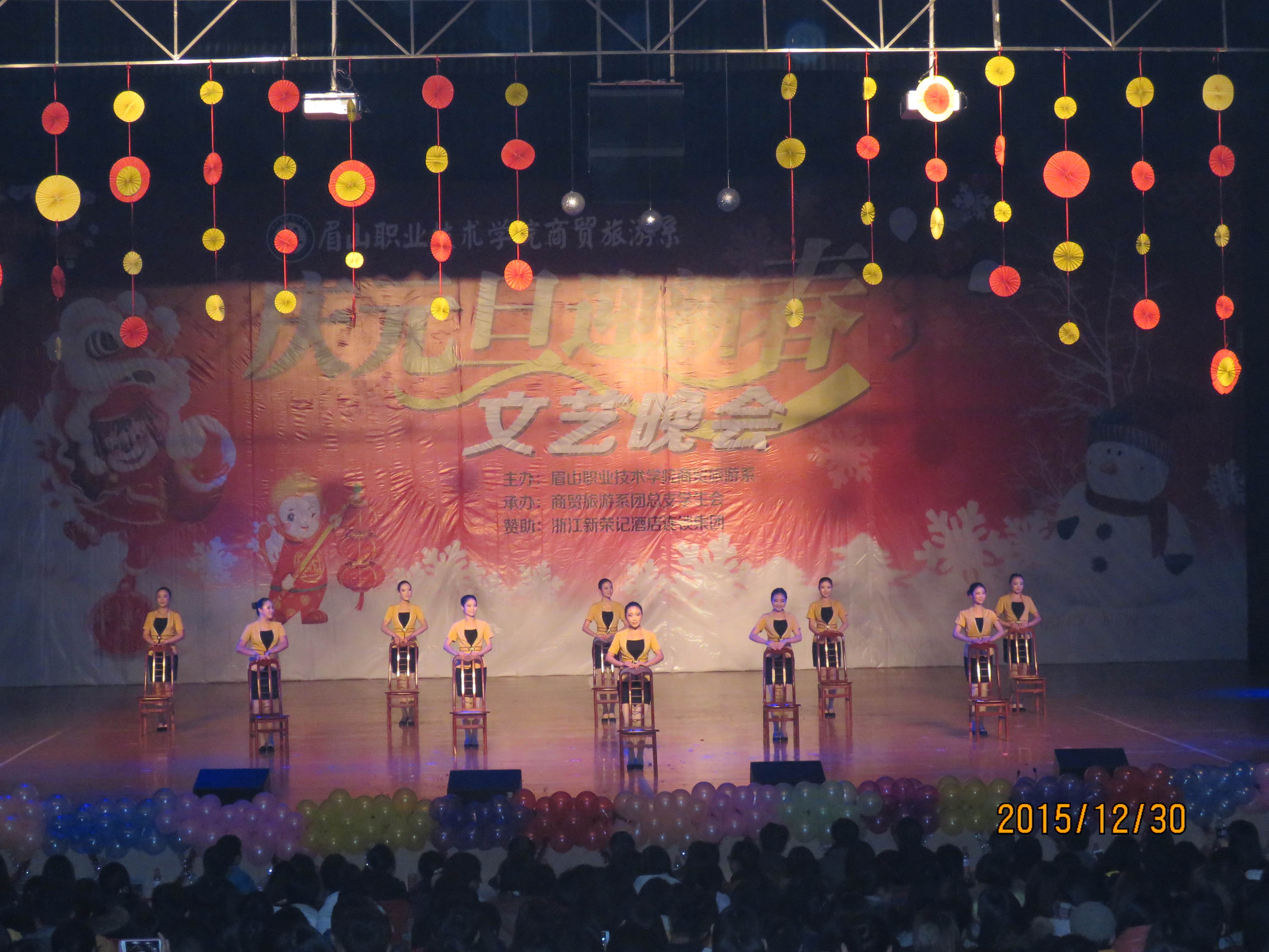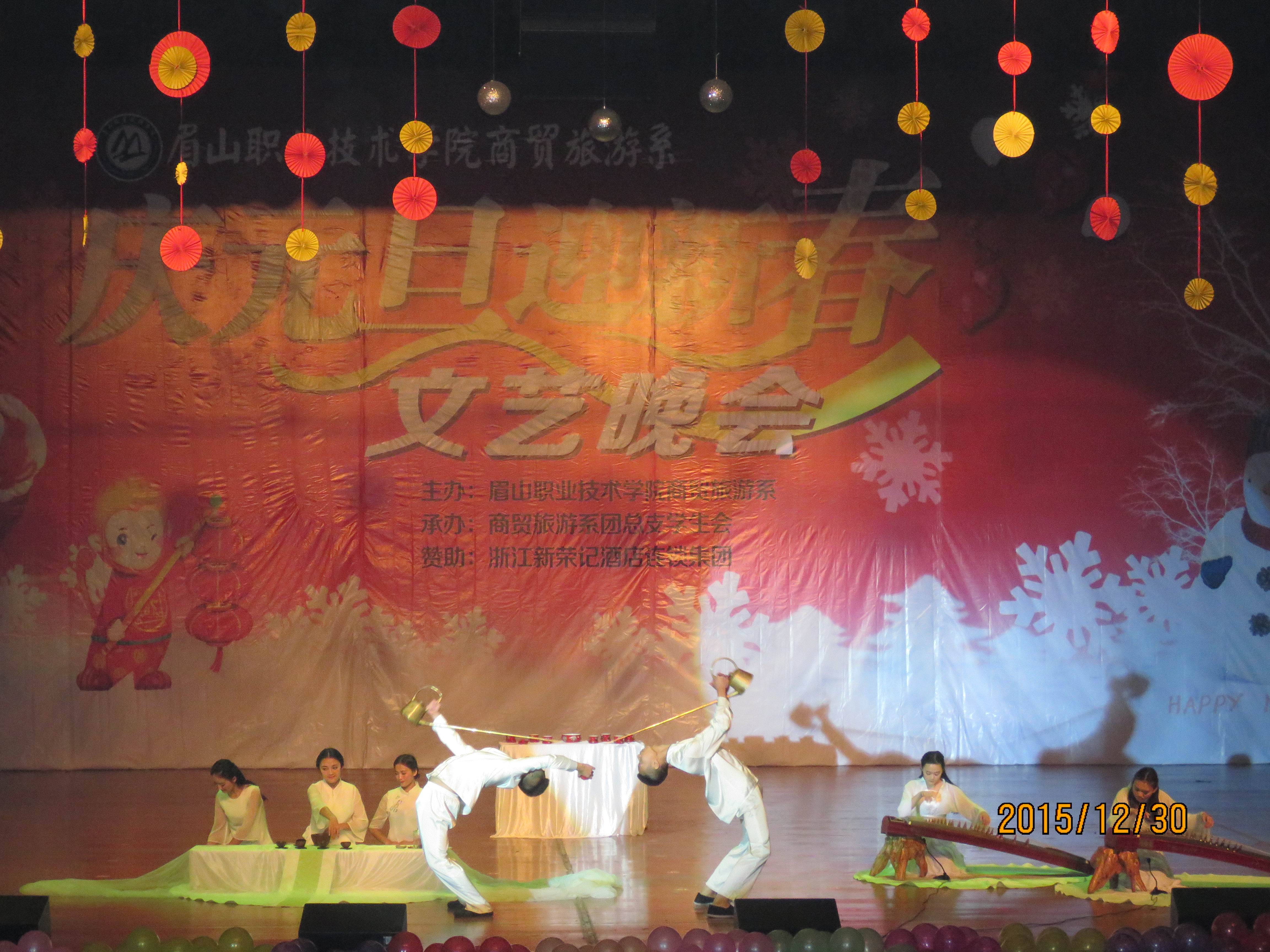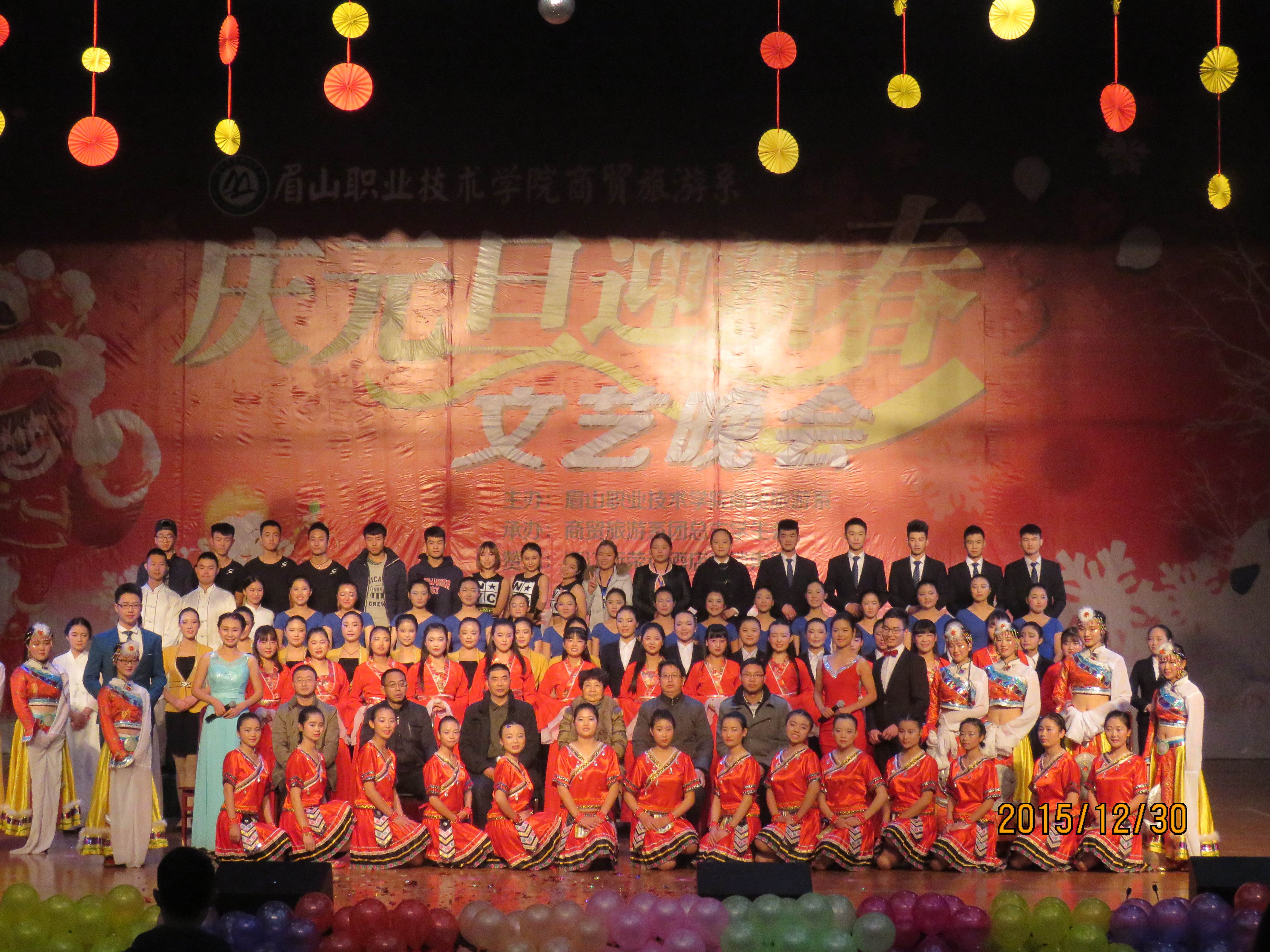 商贸旅游系2016年“庆元旦.迎新春”文艺晚会30日晚在艺术中心举行。学院党委副书记刘晓琼、院工会主席胡洪安、农业技术系党总支书记赵建聪、商贸旅游系主任彭瑞清、商贸旅游系党总支副书记杨光辉等,与商贸旅游系、文化艺术系千余名师生一起观看了演出,喜迎新年的到来。