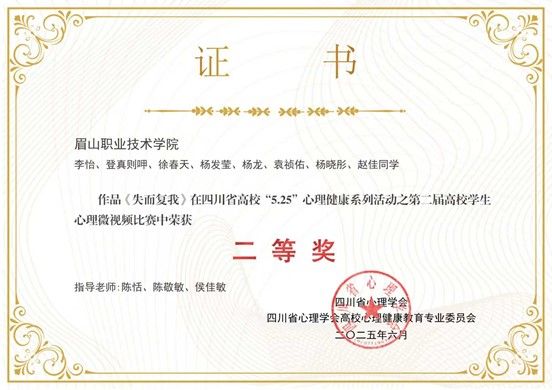 近日,在四川省心理学会高校心理健康教育专委会举办的2025年全省高校“5.25”心理健康系列活动,我院心恬辅导员工作室原创的心理情景剧《失而复我》荣获四川省第二届高校学生心理微电影视频比赛二等奖 。