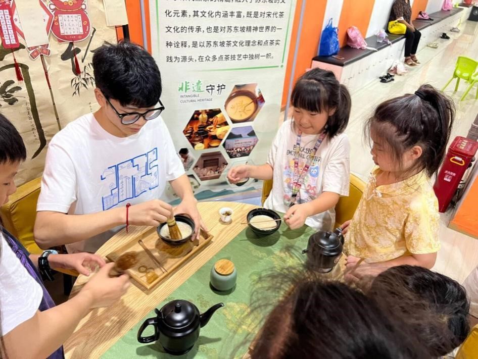 实践中,尹博文跟随团队前往多个社区、乡村、企业,开展了丰富多彩的非遗传承实践。在三苏祠博物馆,他深入了解东坡文化的历史渊源,仔细研究相关文物和资料,为后续的宣传工作积累素材;在眉州东坡酒楼,他向资深厨师学习东坡美食的制作工艺,亲身感受美食背后的文化底蕴;走进旭光社区、文安东路社区、江公社区、苏辙社区时,尹博文和团队成员们展示东坡点茶非遗技艺,让更多人了解到东坡非遗文化。在与群众的互动中,尹博文耐心讲解,手把手教学,他的热情和专业得到社区群众一致好评。此外,尹博文还前往雅安县茶产业基地等,调研当地特色产业与东坡文化的融合发展情况。